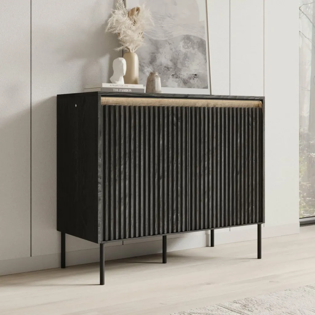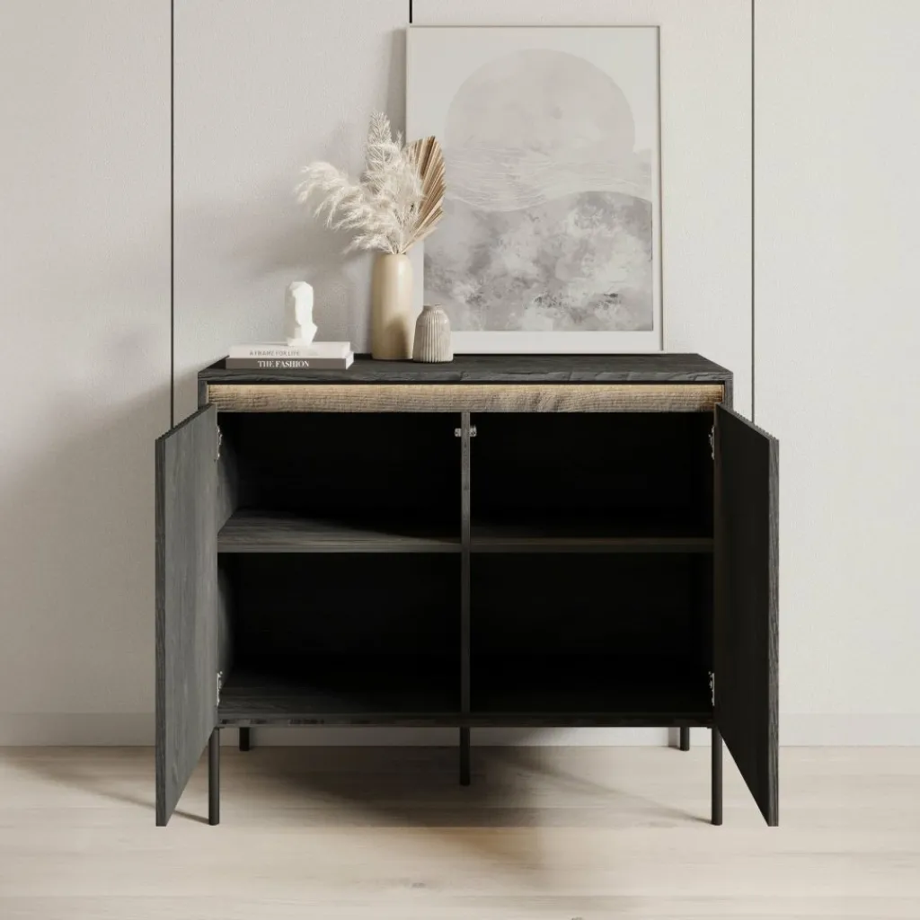 Dressoir Timoteo is een opbergkast in moderne, industriële stijl. Het dressoir staat op hoge, zwarte pootjes, wat zorgt voor een luchtige en stoere uitstraling.
