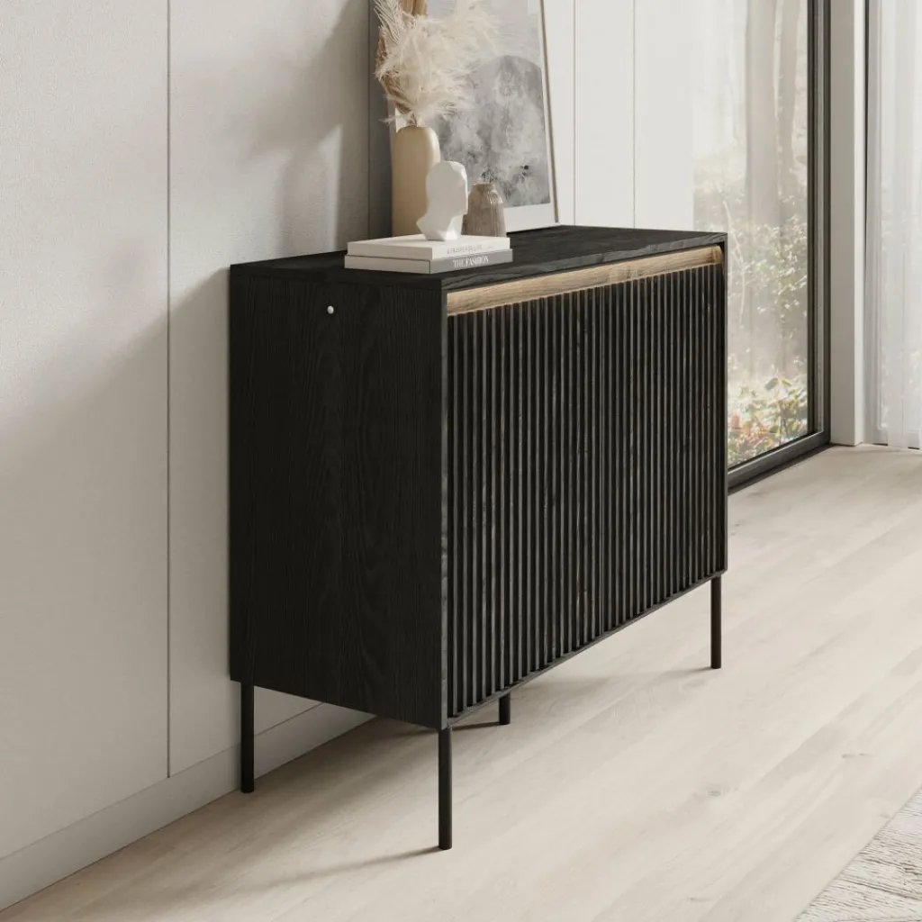 De kast heeft 2 greeploze deuren die eenvoudig via de bovenzijde geopend kunnen worden. Achter de deuren bevinden zich 4 opbergvakken, ideaal voor het overzichtelijk opbergen van je spullen. De deurfronten zijn afgewerkt met een stijlvol lattenpatroon dat het meubel een eigentijdse uitstraling geeft.