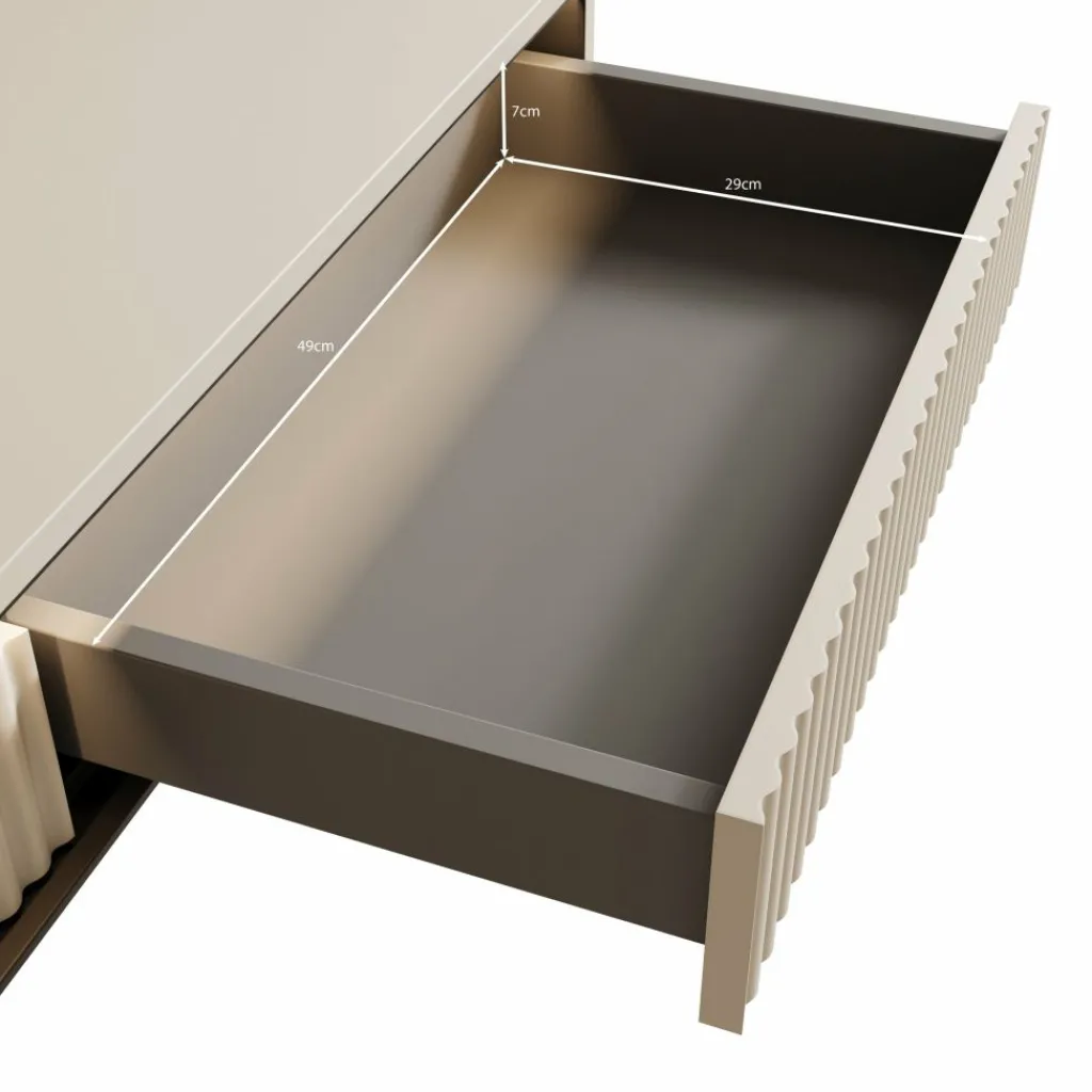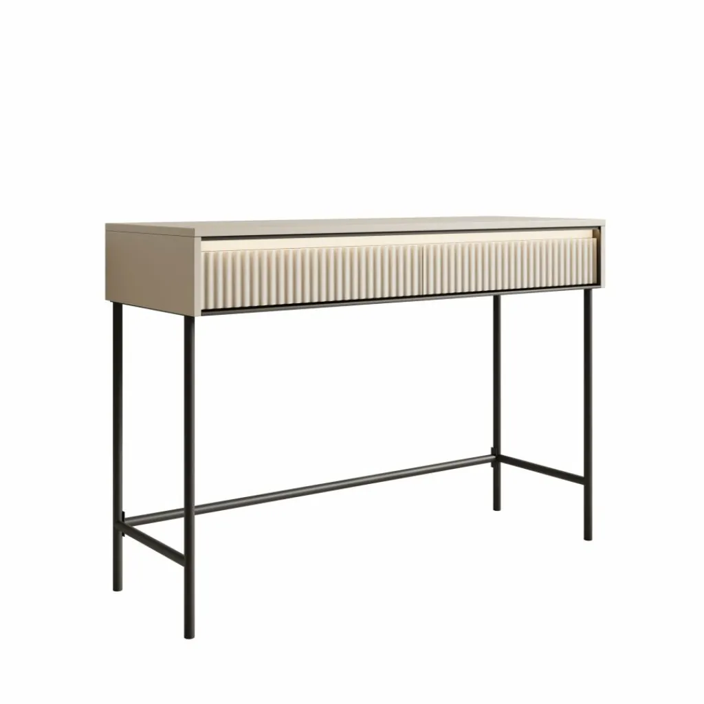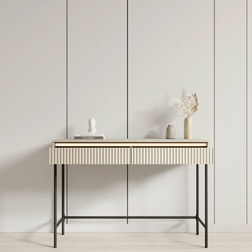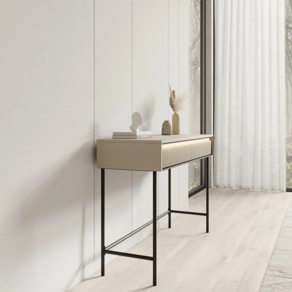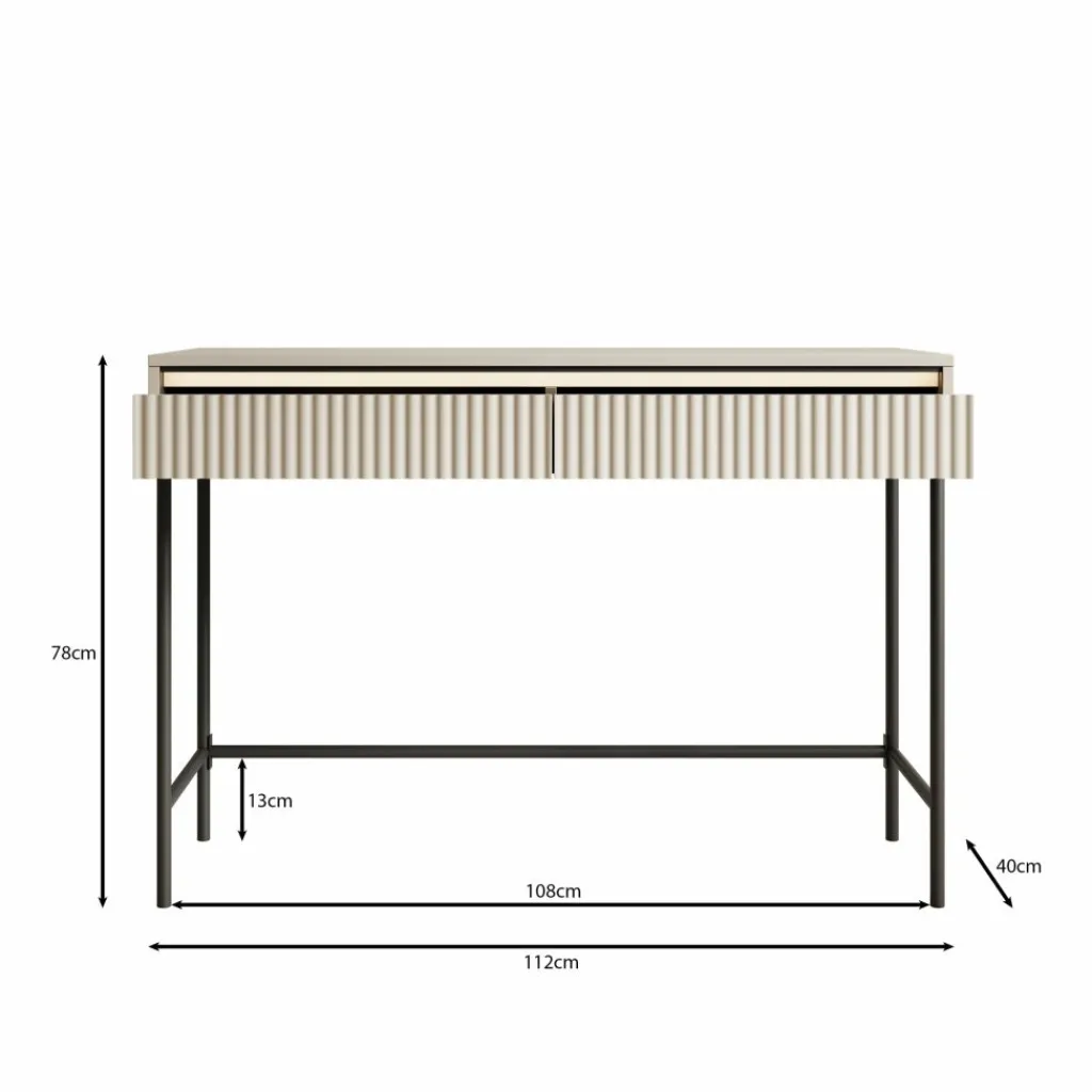 De kaptafel Timoteo is een moderne blikvanger in hotel chique stijl. Het meubel is uitgevoerd in een warme beige kleur en beschikt over twee ruime, greeploze lades. De ladefronten zijn voorzien van een stijlvol lattenpatroon, wat zorgt voor een luxe en subtiel speels accent. Boven de lades bevindt zich een geïntegreerde LED-strip, die zorgt voor een zachte, sfeervolle verlichting tijdens het opmaken of stylen.