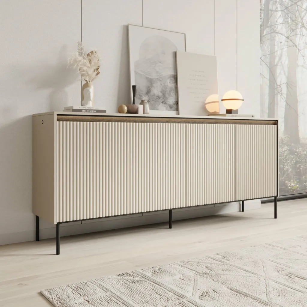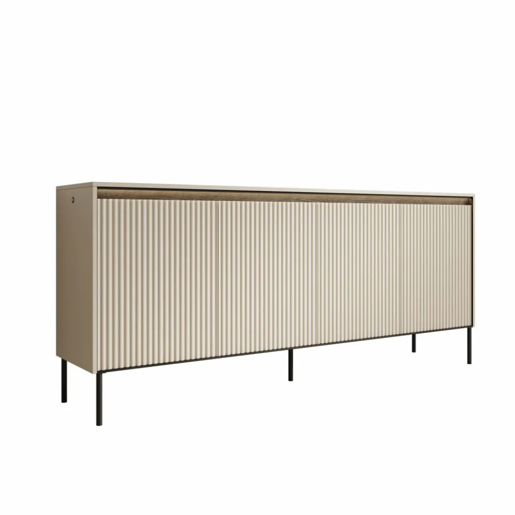 Dressoir Timoteo is een opbergkast in moderne, industriële stijl. Het dressoir staat op hoge, zwarte pootjes, wat zorgt voor een stoere en luchtige uitstraling.
