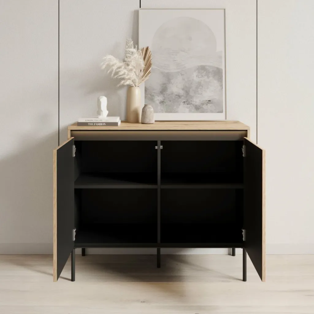 Dressoir Timoteo is een opbergkast in moderne, industriële stijl. Het dressoir staat op hoge, zwarte pootjes, wat zorgt voor een stoere en luchtige uitstraling.