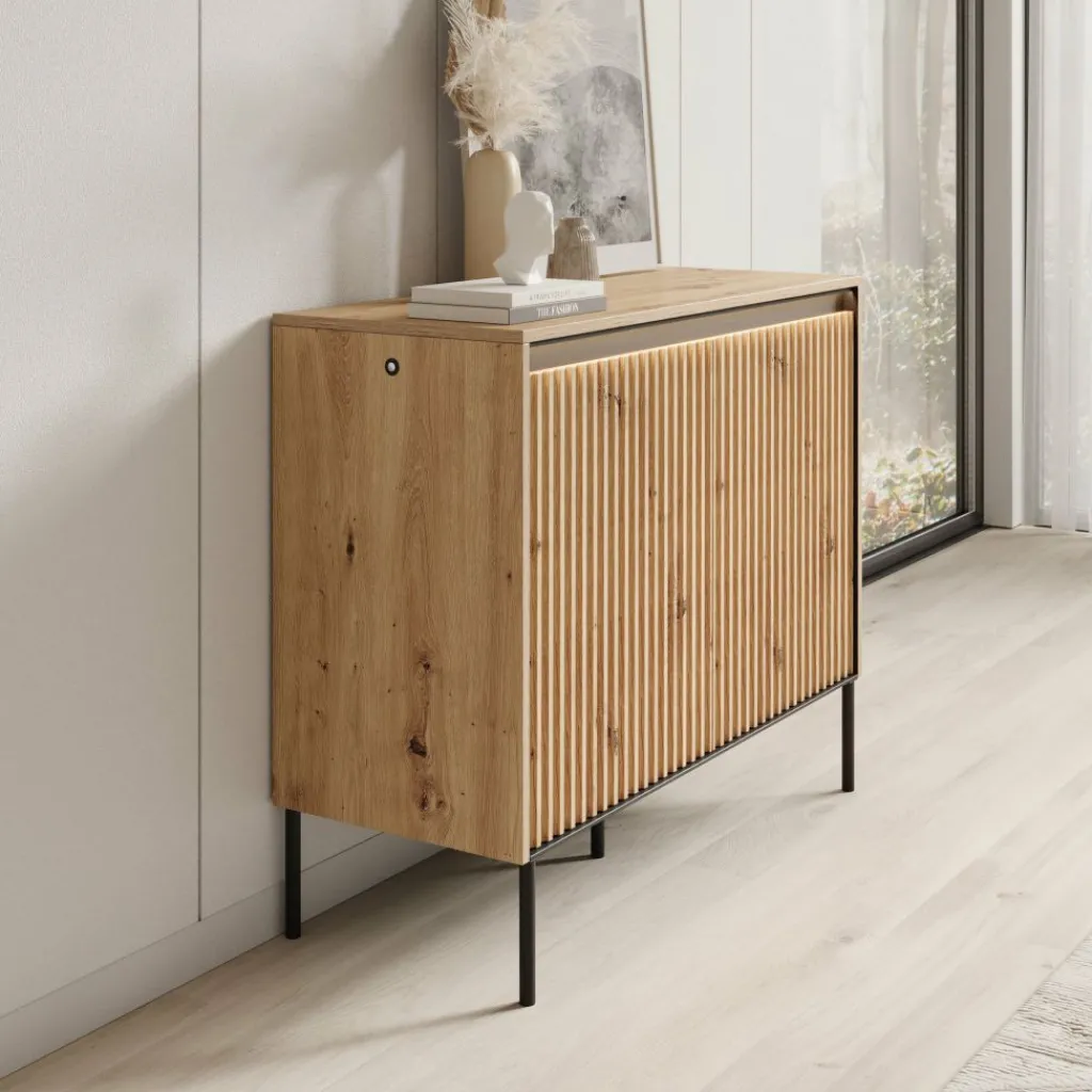 Daarnaast is het dressoir uitgerust met geïntegreerde ledverlichting. Dit zorgt voor een subtiel en sfeervol accent en maakt het bovenblad extra geschikt voor decoratie.