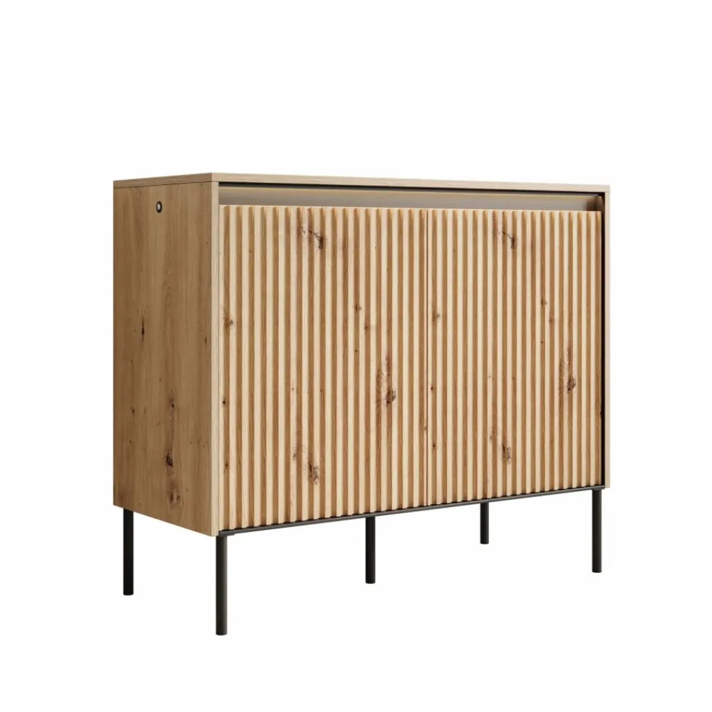 De kast heeft 2 greeploze deuren die eenvoudig via de bovenzijde geopend kunnen worden. Achter de deuren bevinden zich 4 opbergvakken, ideaal voor het overzichtelijk opbergen van je spullen. De deurfronten zijn voorzien van een stijlvol lattenpatroon dat het meubel een eigentijdse uitstraling geeft.