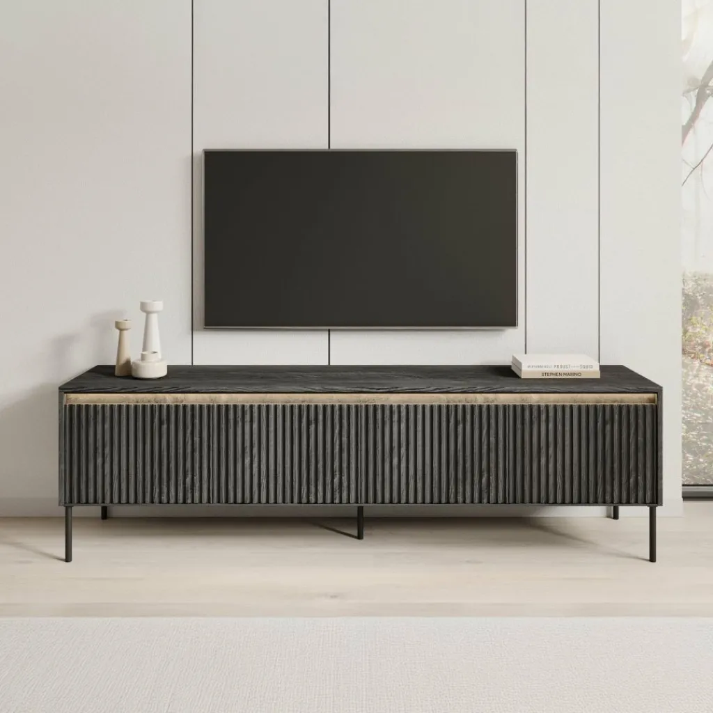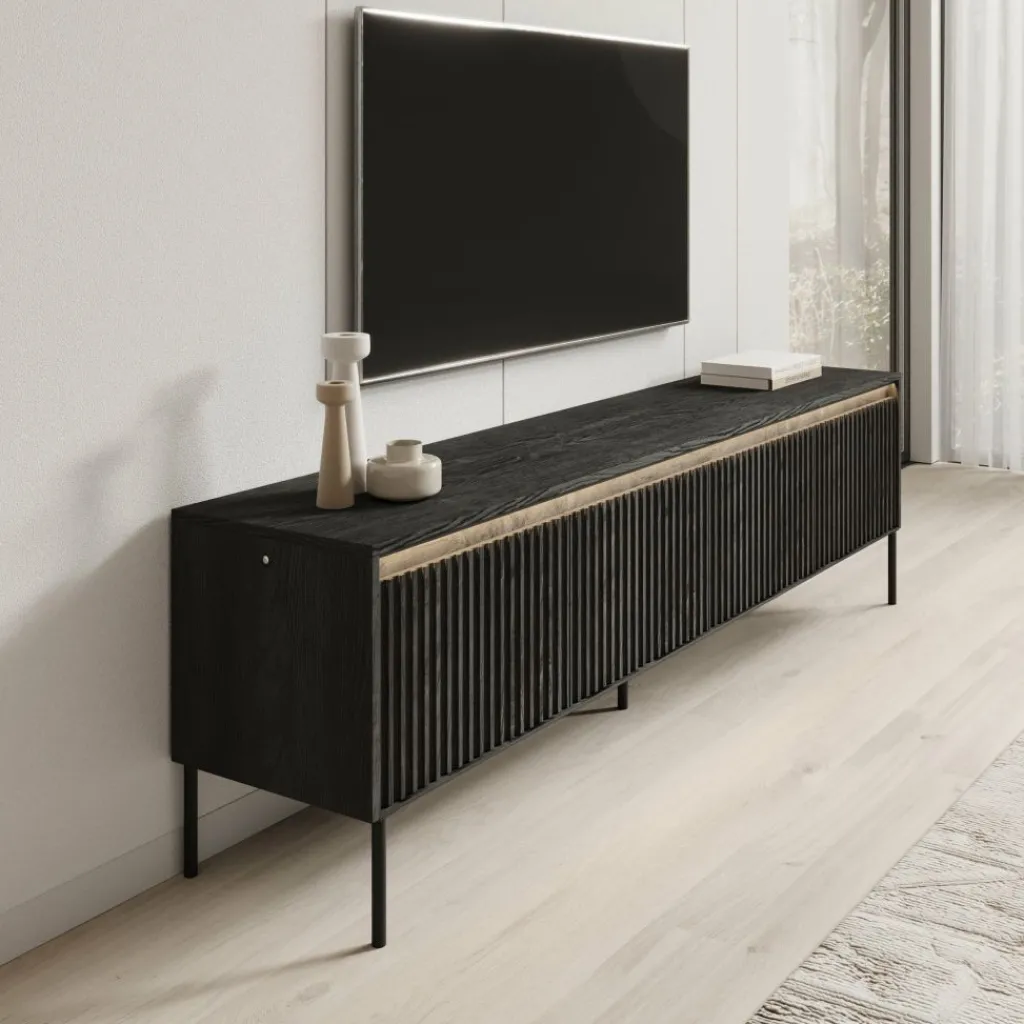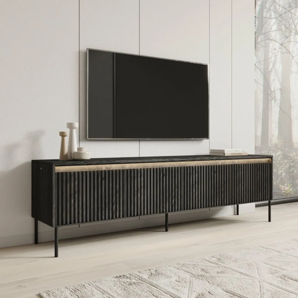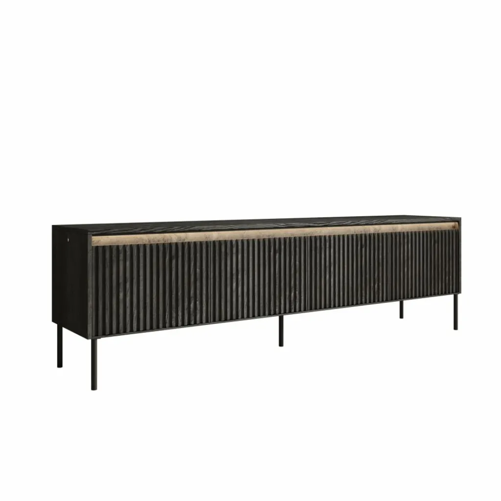 Bovendien is het tv-meubel uitgerust met geïntegreerde ledverlichting. Dit geeft een sfeervol accent aan de woonkamer en maakt het bovenblad extra geschikt voor decoratie. Het geheel staat op hoge, zwarte pootjes, wat het meubel een luchtige en robuuste look geeft.