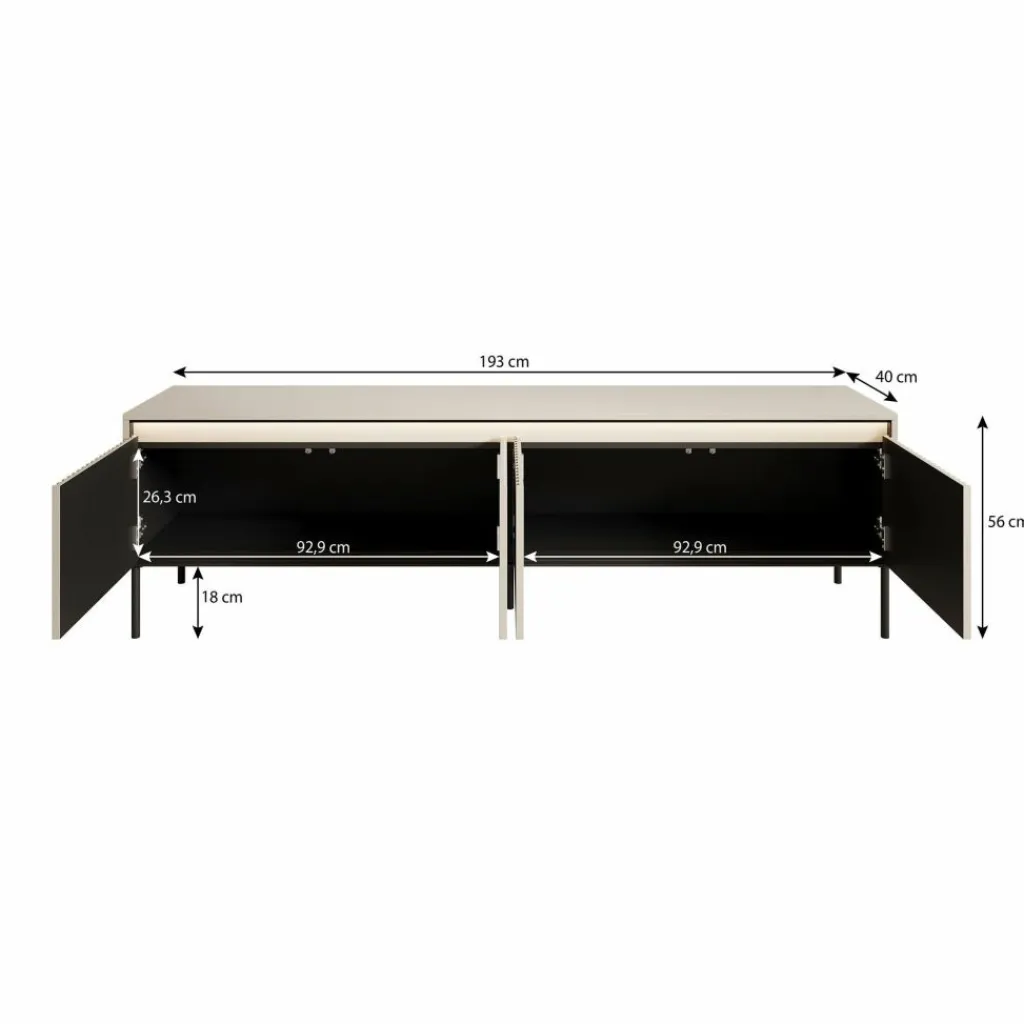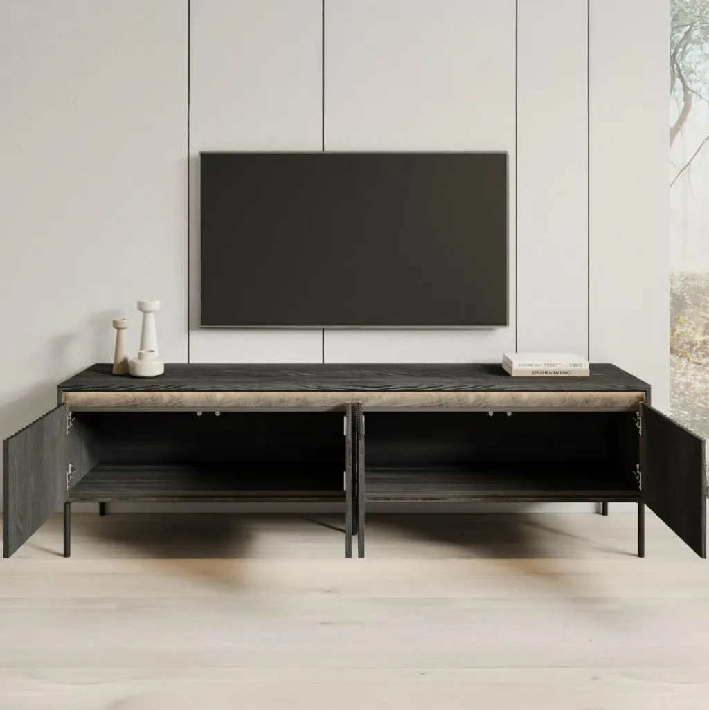 De kast beschikt over 4 greeploze deuren die geopend worden via de bovenzijde. Achter de deuren bevinden zich 2 ruime opbergvakken, ideaal voor het opbergen van apparatuur, kabels en andere spullen. De deurfronten zijn voorzien van een strak lattenpatroon dat zorgt voor een moderne uitstraling.