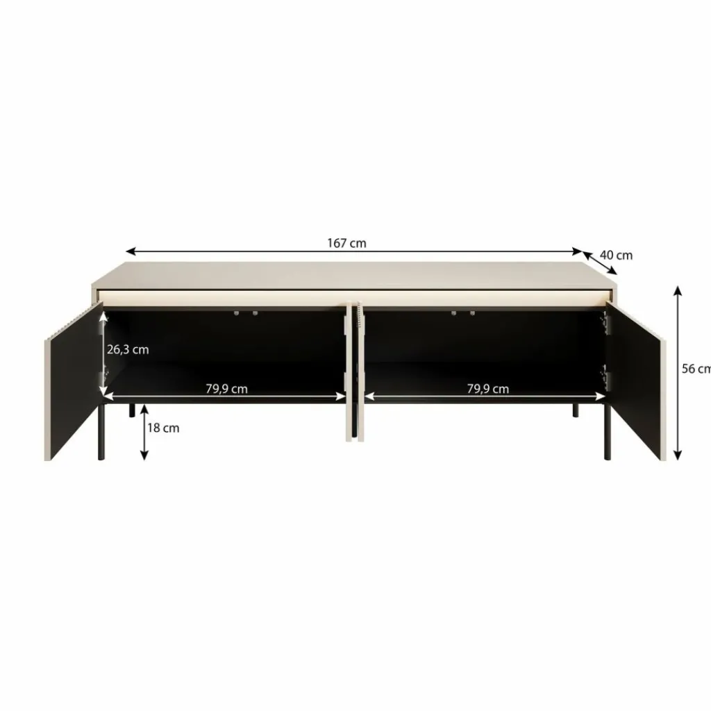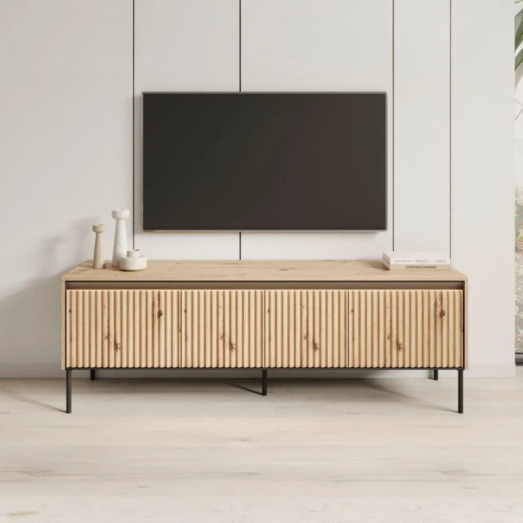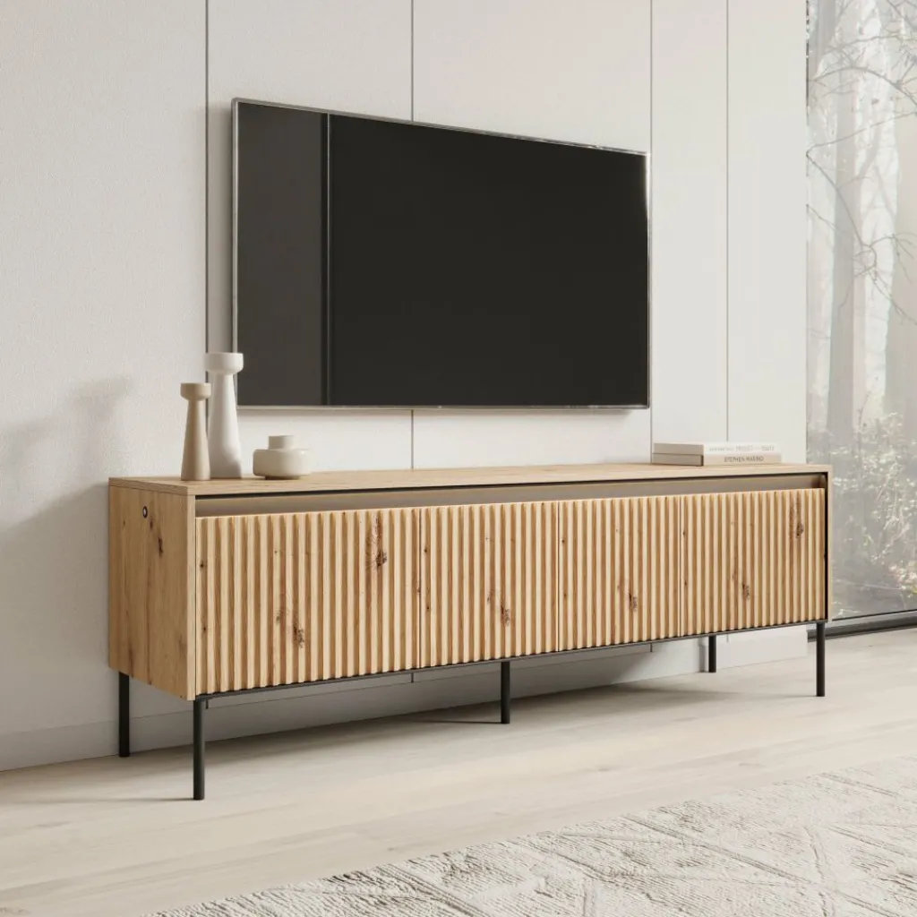 De kast beschikt over 4 greeploze deuren die geopend worden via de bovenzijde. Achter de deuren bevinden zich 2 opbergvakken, ideaal om apparatuur, kabels of andere spullen netjes in op te bergen. De deurfronten zijn voorzien van een stijlvol lattenpatroon, wat het meubel een eigentijdse uitstraling geeft.