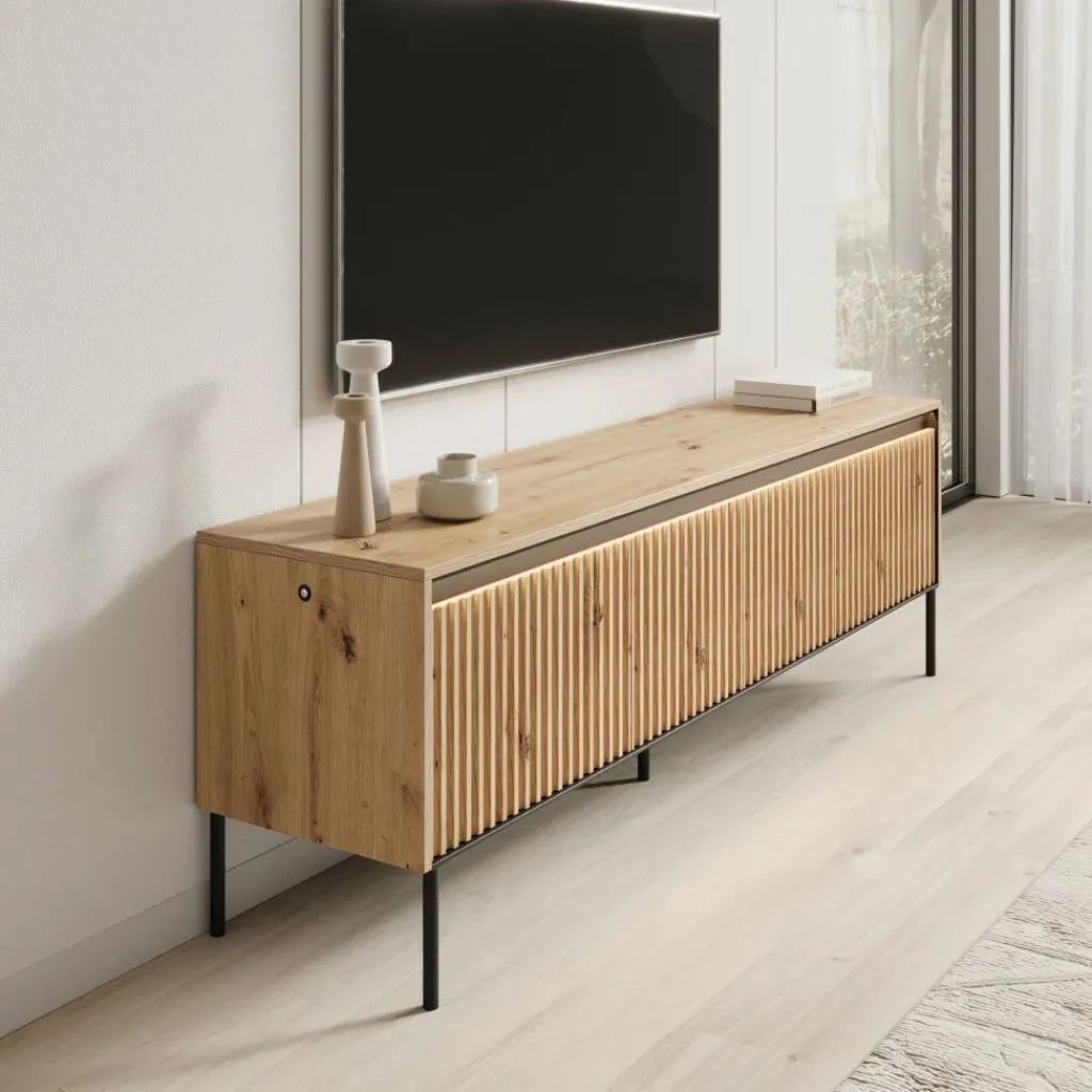Daarnaast is het tv-meubel uitgerust met geïntegreerde ledverlichting. Dit zorgt voor een sfeervol accent in de woonkamer en maakt het bovenblad extra geschikt voor decoratieve items.