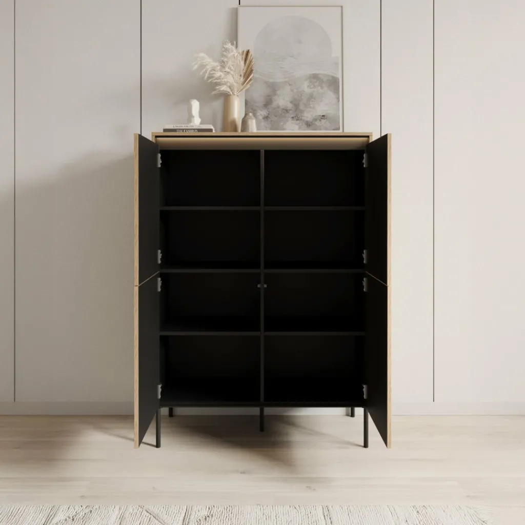 Dressoir Timoteo is een opbergkast in moderne, industriële stijl. Het dressoir staat op hoge, zwarte pootjes.