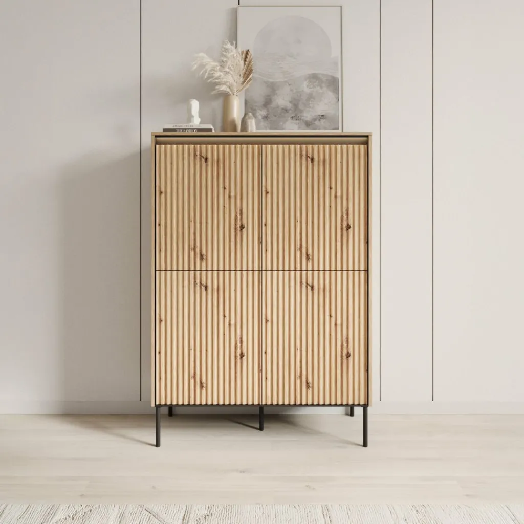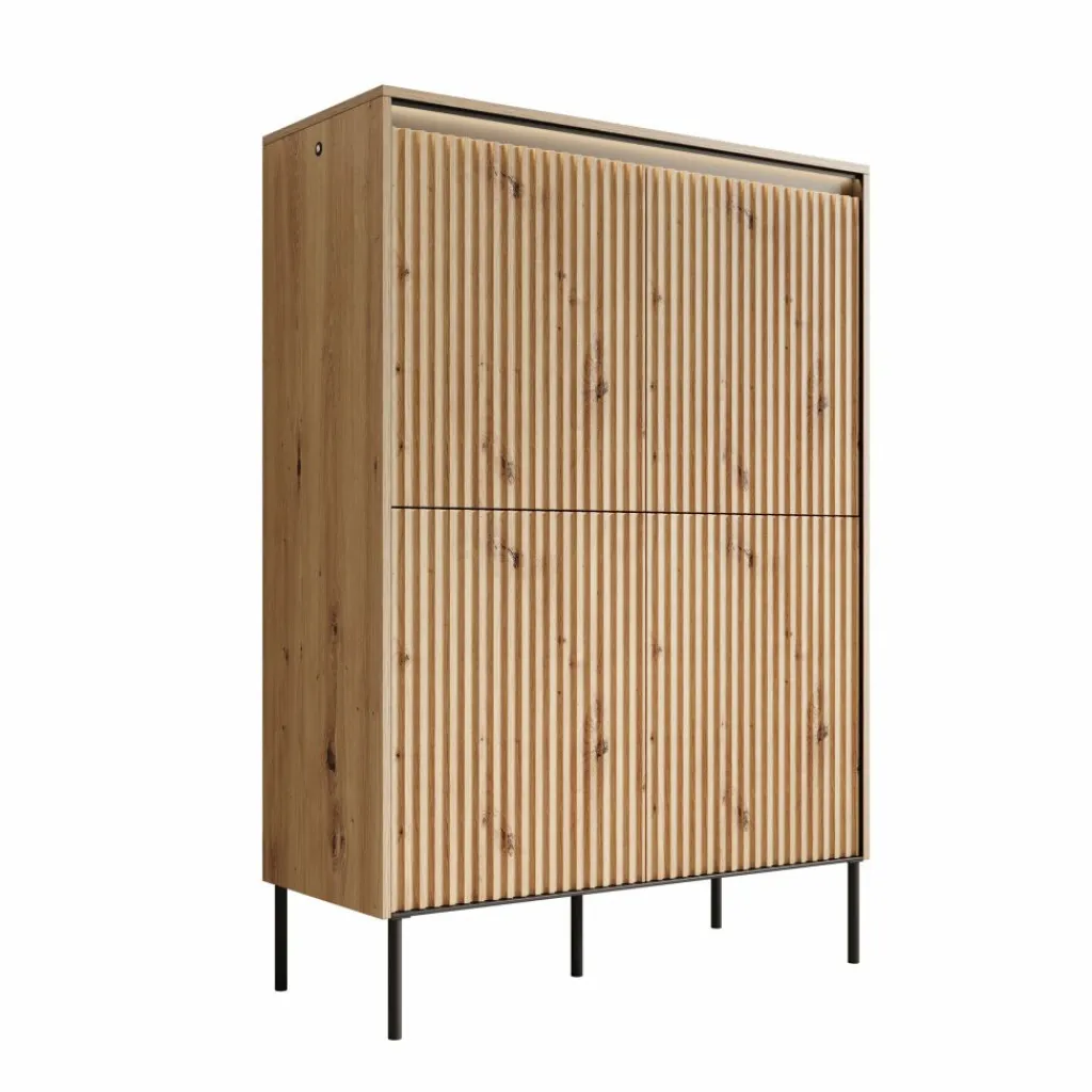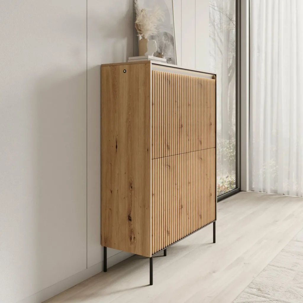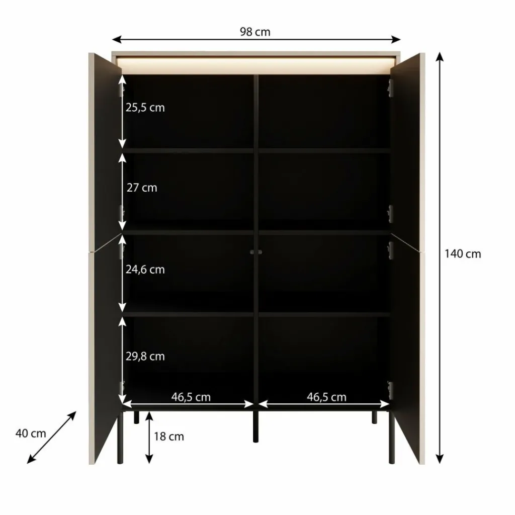 De kast heeft 4 deuren. De deuren zijn greeploos en openen via een push-to-open systeem. Achter de deuren zitten 8 opbergvakken. Het dressoir beschikt over LED-verlichting.