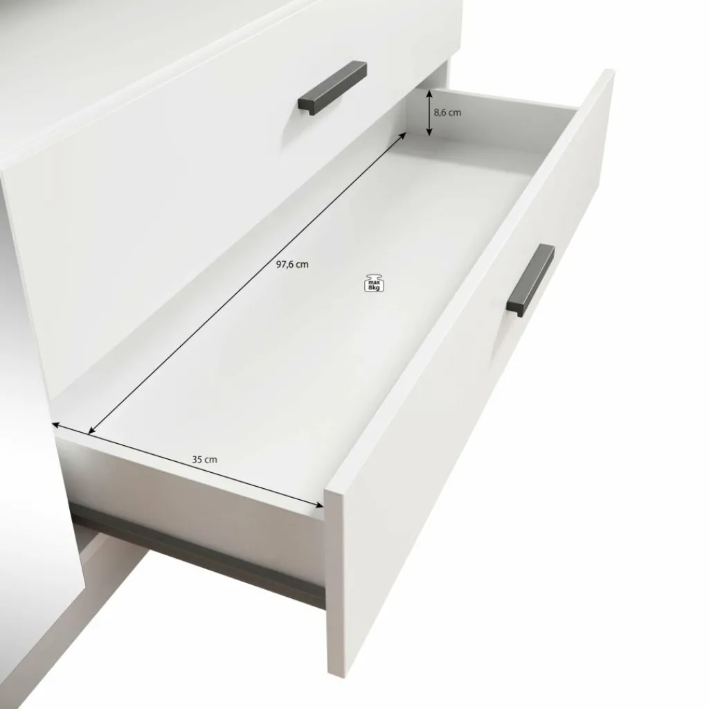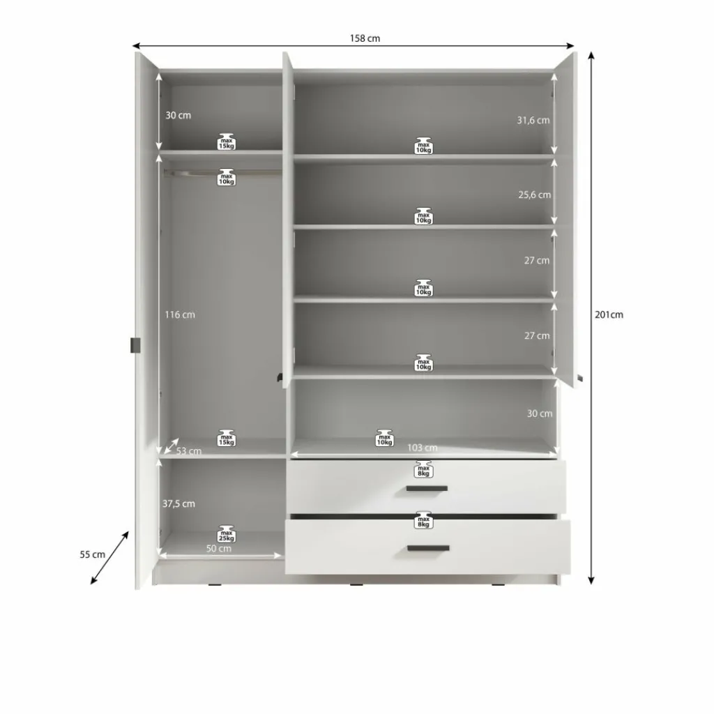 De kast is ingedeeld met een combinatie van legplanken, een hanggedeelte en twee ruime lades, waardoor je moeiteloos al je kleding en accessoires overzichtelijk kunt opbergen. Het open vak in het midden geeft de kast een moderne uitstraling en biedt extra ruimte voor decoratie of boeken.