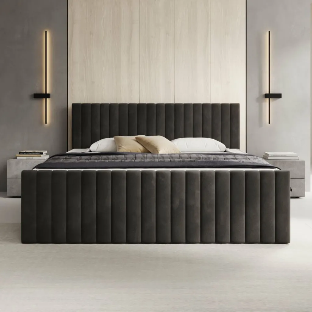 De constructie wordt afgewerkt met een gestoffeerde bekleding met verticale stiksels, wat het bed een herkenbare en strakke uitstraling geeft. De gebruikte Manila stof heeft een fluweelachtige structuur en behoort tot de pluche stoffen. Het materiaal is slijtvast, bestand tegen wrijving, verkleuring en pilling en beschikt over vlamvertragende eigenschappen. Voor onderhoud kan de stof met de hand op lage temperatuur worden gereinigd; niet bleken, strijken of drogen in de droger.