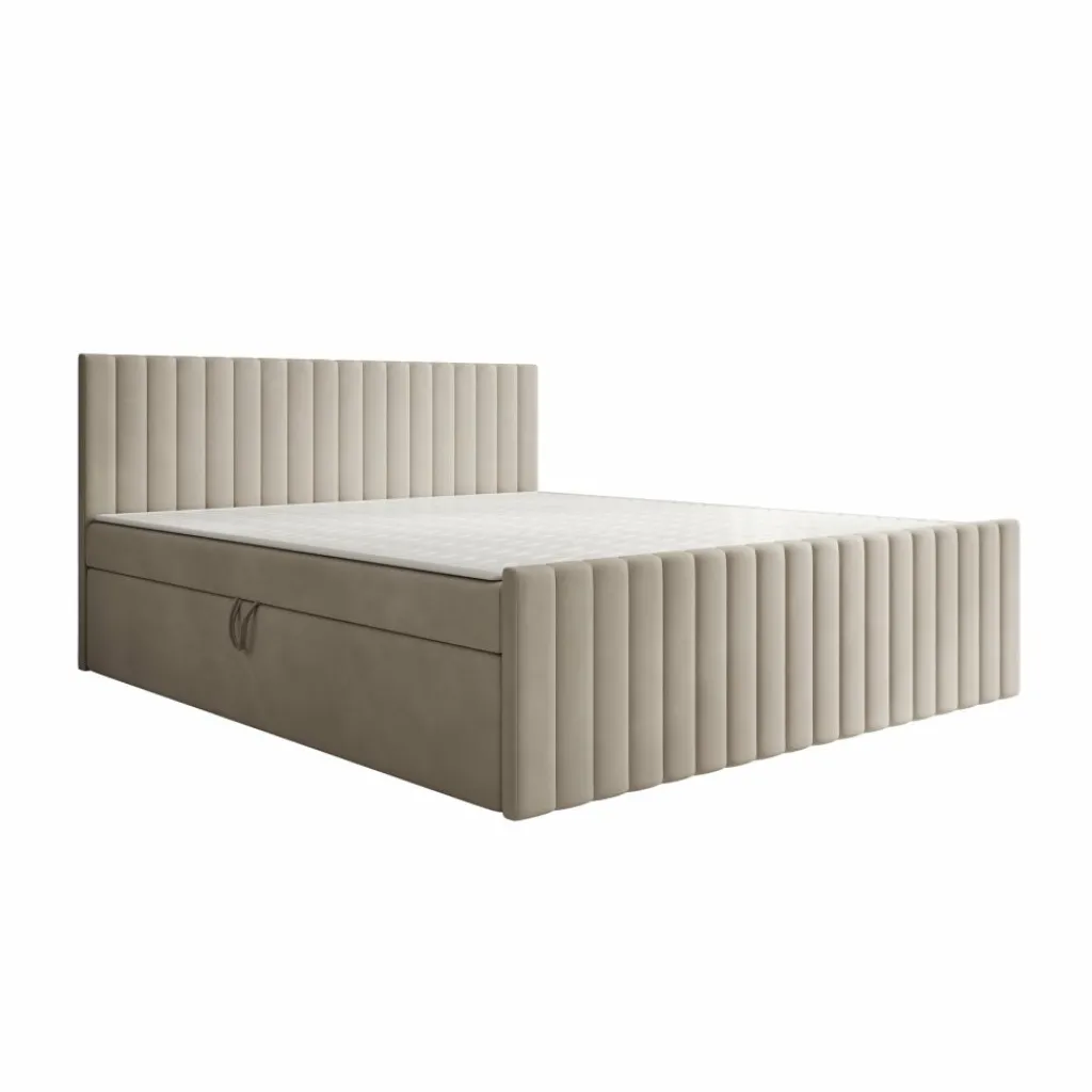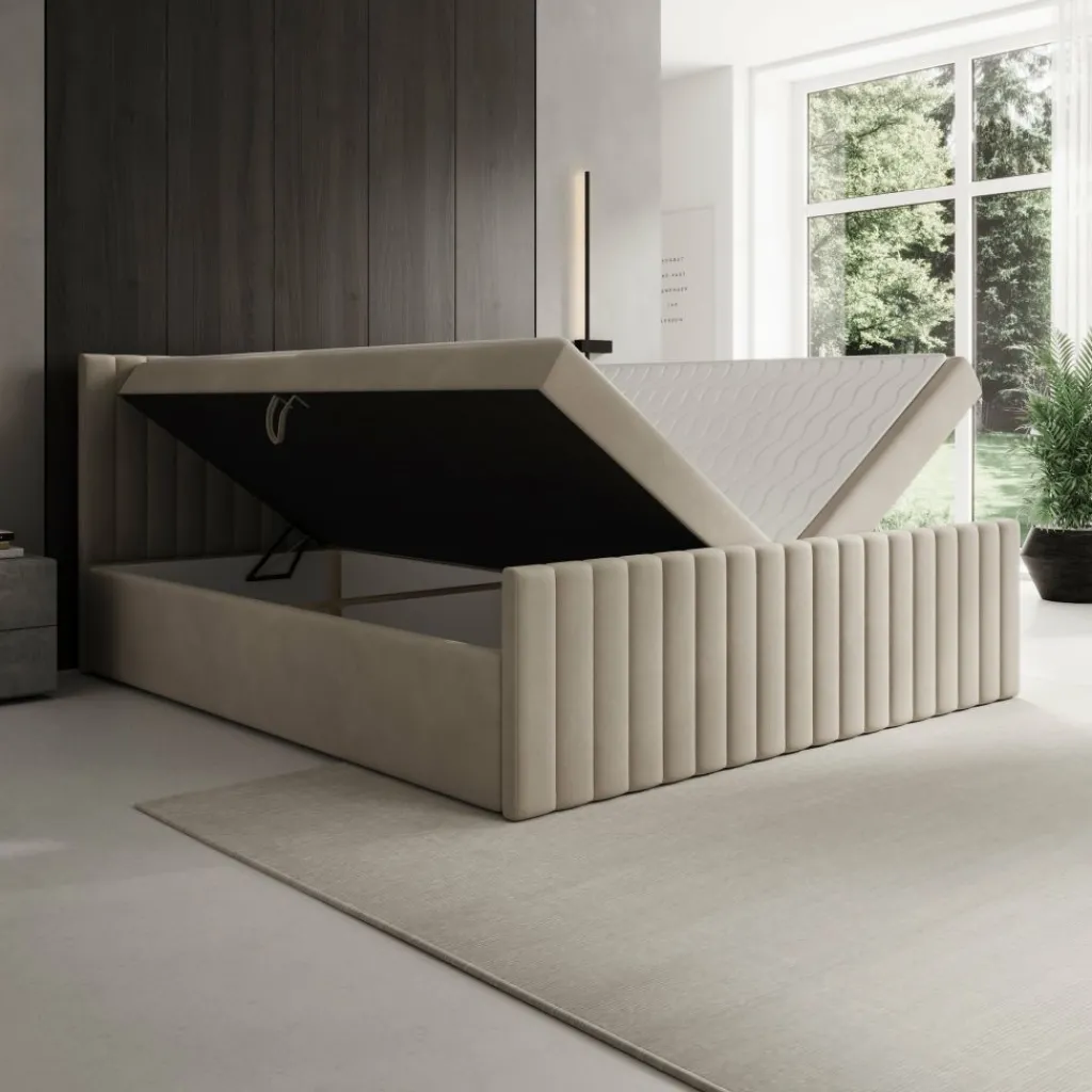 Het bed is voorzien van twee opbergvakken aan weerszijden van het bed en biedt daarmee een praktische opbergoplossing voor beddengoed of seizoensartikelen. Een veermechanisme maakt het openen licht en comfortabel, zodat je eenvoudig toegang krijgt tot de ruimte onder het matras. Het hoofdmatras biedt stabiele lichaamsondersteuning en langdurige vormvastheid, waarbij de H3-hardheid geschikt is voor wie graag op een stevige basis slaapt. Daarboven ligt een topper die het ligoppervlak egaliseert en het geheel compleet maakt.