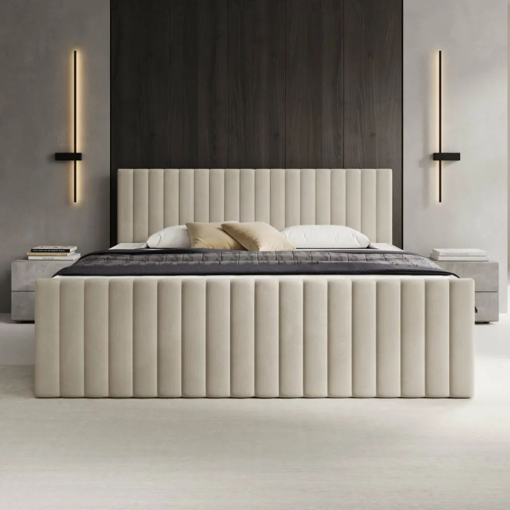 De constructie wordt afgewerkt met een gestoffeerde bekleding met verticale stiksels, wat het bed een herkenbare en strakke uitstraling geeft. De gebruikte Manila stof heeft een fluweelachtige structuur en behoort tot de pluche stoffen. Het materiaal is slijtvast, bestand tegen wrijving, verkleuring en pilling en beschikt over vlamvertragende eigenschappen. Voor onderhoud kan de stof met de hand op lage temperatuur worden gereinigd; niet bleken, strijken of drogen in de droger.