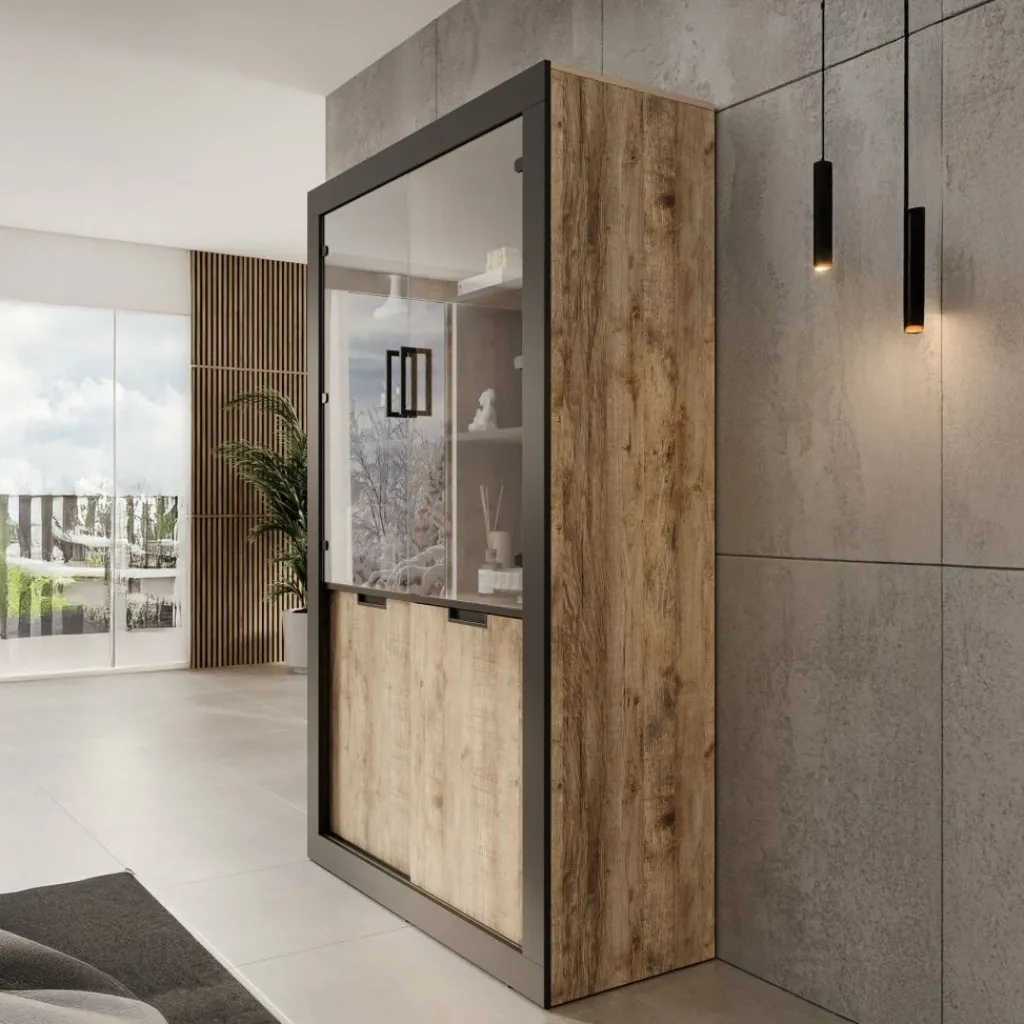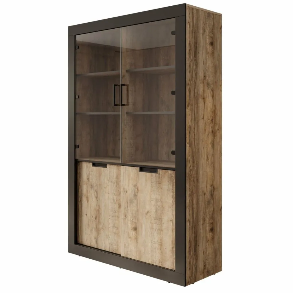 Buffetkast Trinidad is een praktisch vormgegeven kast in eiken kleur met zwart. De kast beschikt over 4 deuren. De onderste 2 deuren zijn schuifdeuren en de bovenste 2 deuren zijn scharnierdeuren die openen met zwarte handgrepen. Ook zijn deze 2 bovenste deuren volledig gemaakt van glas. In de binnenkant zijn 10 opbergvakken te vinden.
