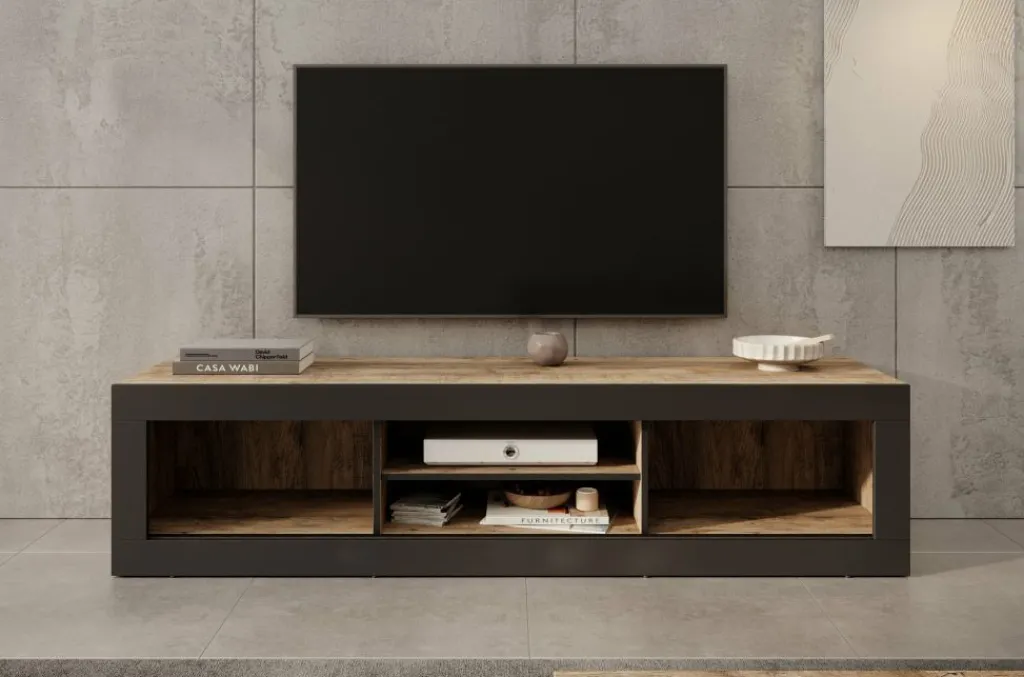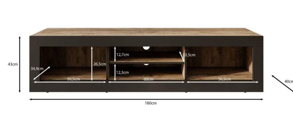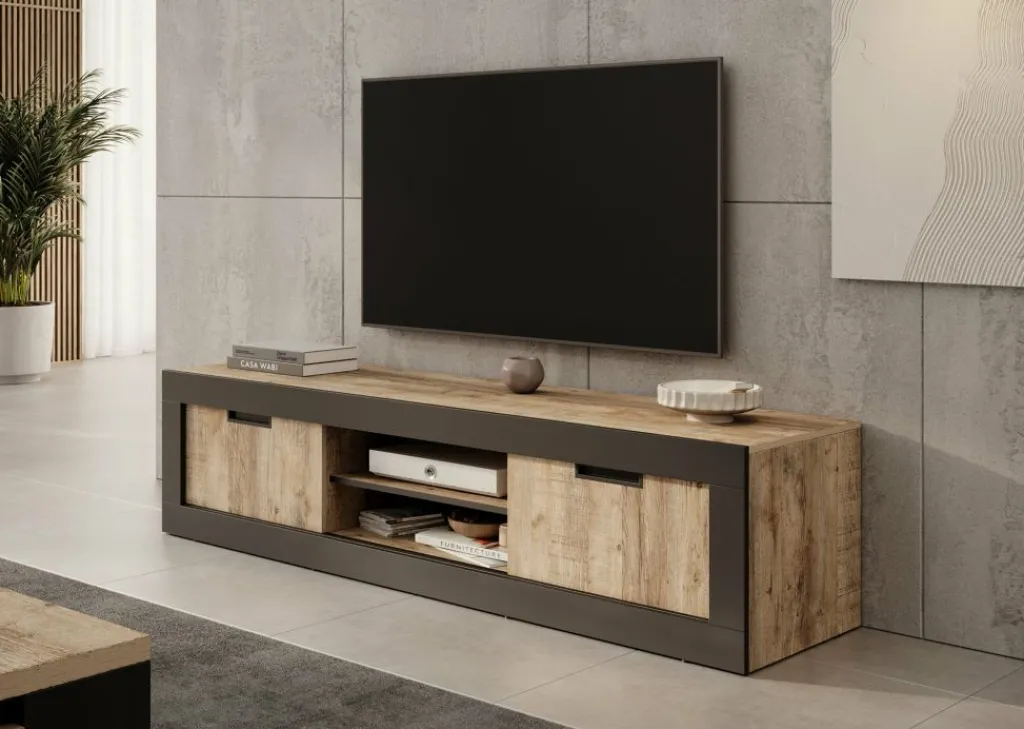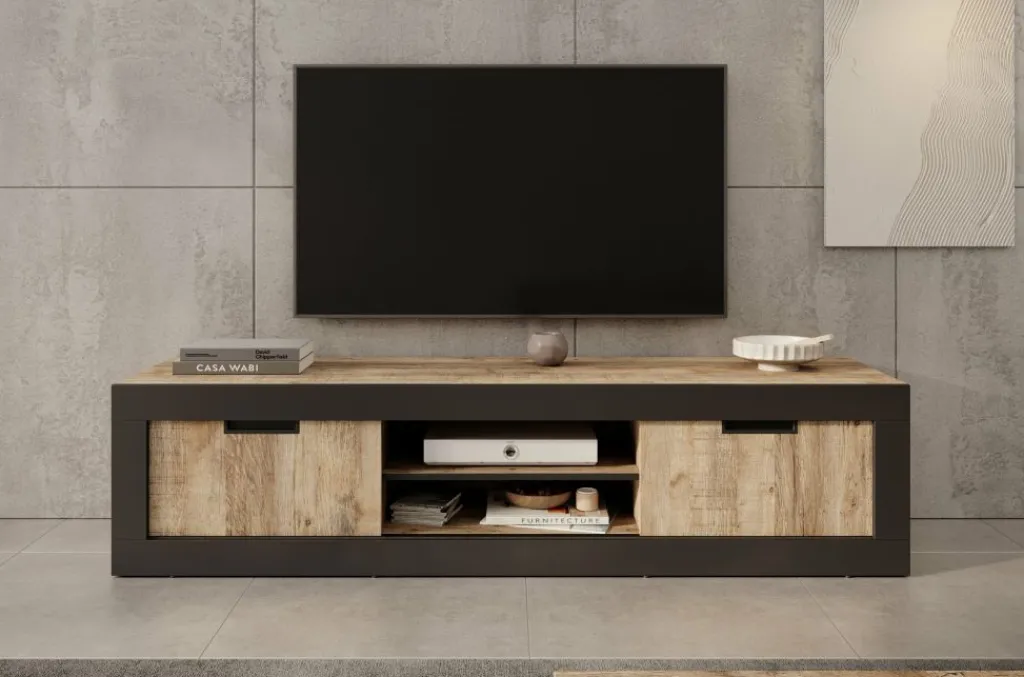 TV-Meubel Trinidad is een opbergkast voor onder de tv in een industriële stijl. De kast beschikt over 2 schuifdeuren die openen met zwarte handgrepen. Achter deze schuifdeuren zijn in totaal 2 opbergvakken te vinden. Ook heeft het meubel nog 2 open vakken. In de achterwand van deze open vakken zijn 2 uitsparingen te vinden op eventuele bedrading gemakkelijk te kunnen wegwerken. Het meubel is uitgevoerd in de kleur eiken met zwart.
