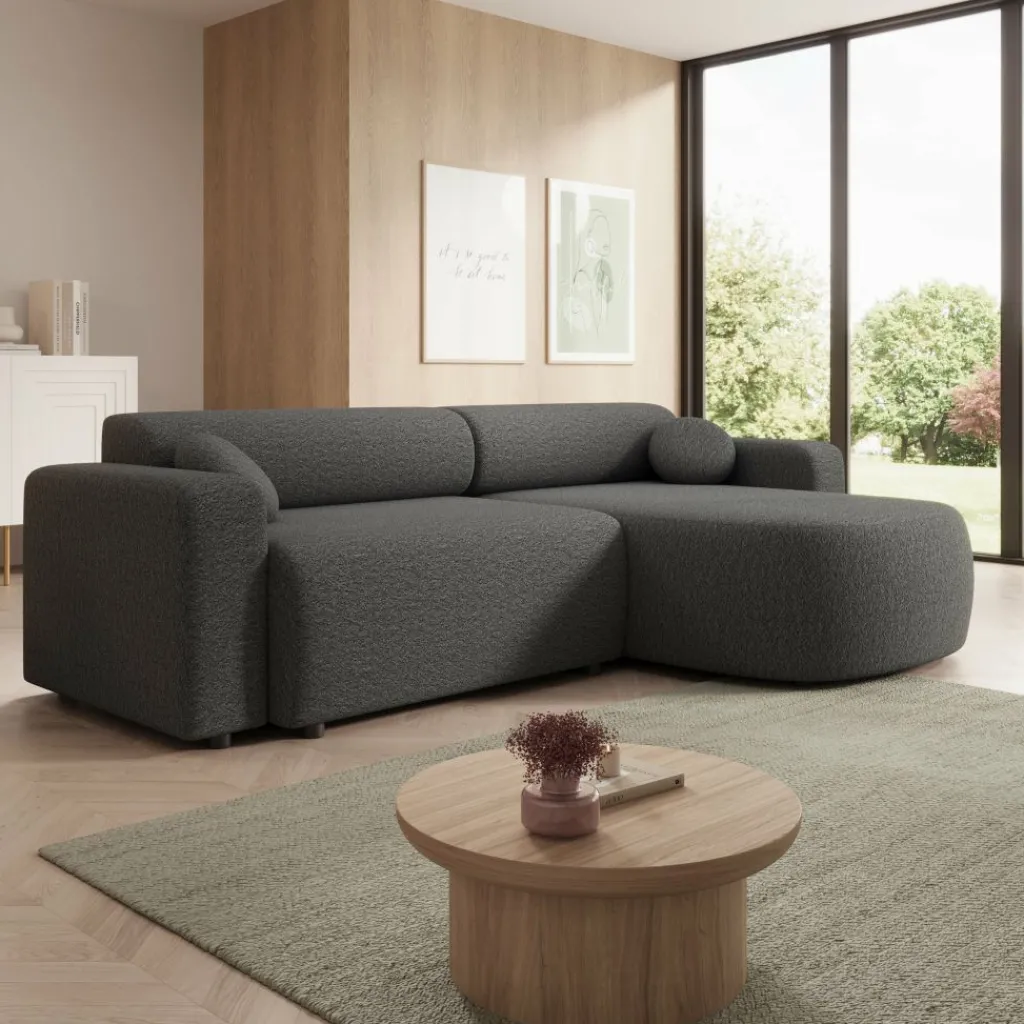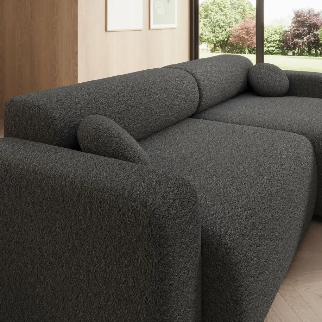 Tripp hoekbank is een stijlvolle 3-zitsbank met chaise longue, uitgevoerd in een zachte grijze stof. Het strakke ontwerp met afgeronde vormen geeft de bank een moderne en uitnodigende uitstraling. Dankzij de universele opstelling kan de chaise longue zowel links als rechts worden geplaatst, waardoor de bank flexibel aansluit bij jouw interieur.