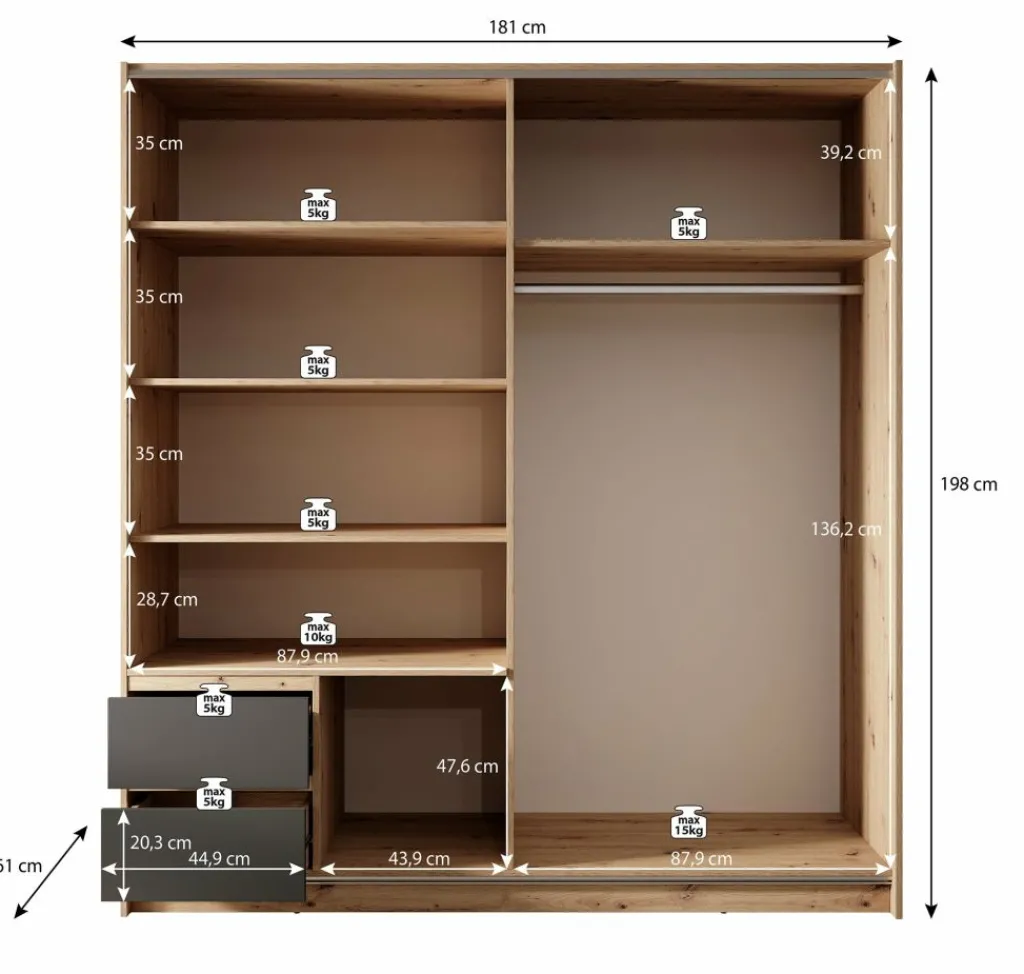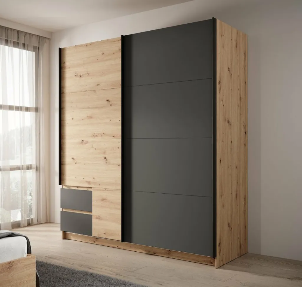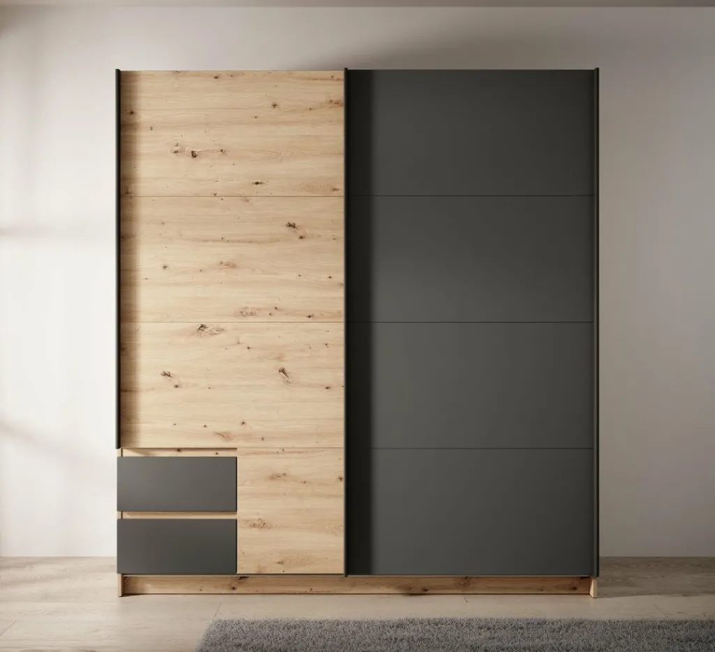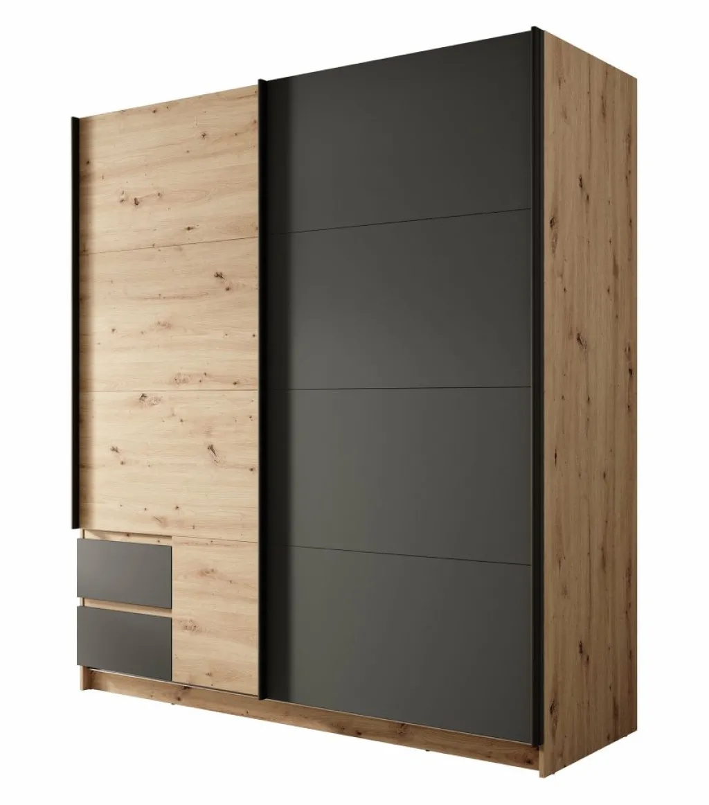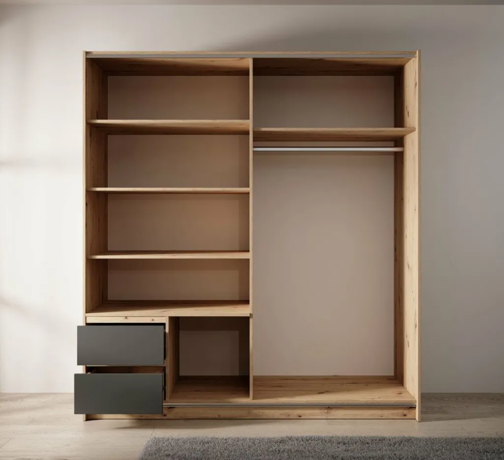Kledingkast Ulan is een praktische garderobekast voor in je slaapkamer in eiken met grijze kleur. Dit model beschikt over 2 schuifdeuren en 2 lades. Deze deuren en lades zijn greeploos. De binnenkant van de Ulan is voorzien van 1 kledingroede en 6 opbergvakken, zodat je al je kleding netjes kunt opbergen en organiseren.