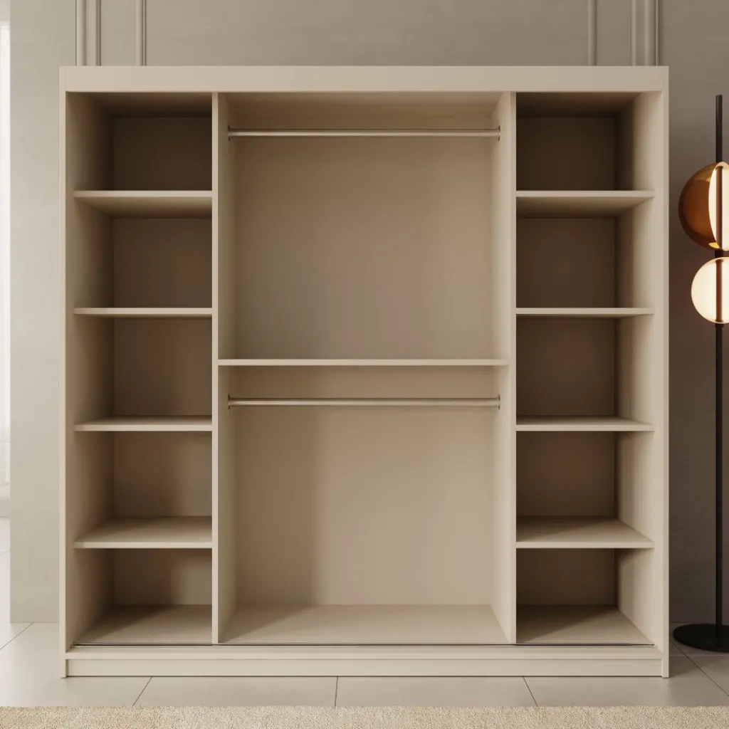 Achter de twee schuifdeuren schuilt een praktische indeling. Twee ruime kledingroedes bieden plek voor hangende kleding, terwijl de tien open vakken perfect zijn voor gevouwen items, accessoires of opbergdozen. Dankzij deze slimme indeling blijft alles overzichtelijk en netjes opgeborgen.