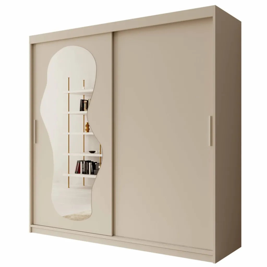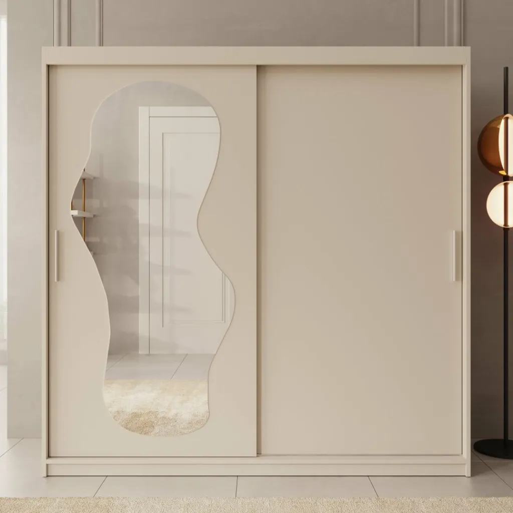 De Ulysses kledingkast van 200 cm combineert moderne eenvoud met een verrassend speelse touch. De beige afwerking straalt rust uit en laat zich moeiteloos combineren in uiteenlopende interieurstijlen. Wat meteen opvalt, is de sierlijk vormgegeven spiegel op de linkerdeur – een decoratief element dat niet alleen functioneel is, maar de kast ook een blikvanger maakt.