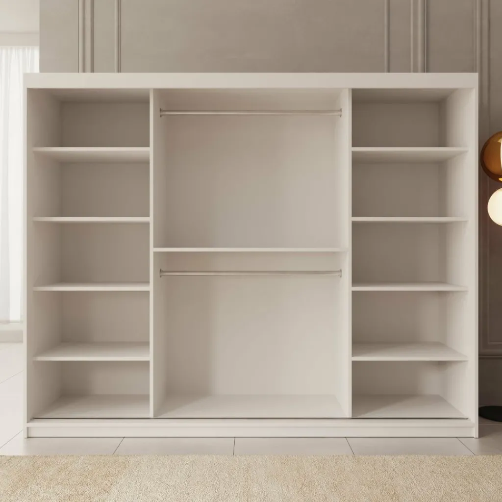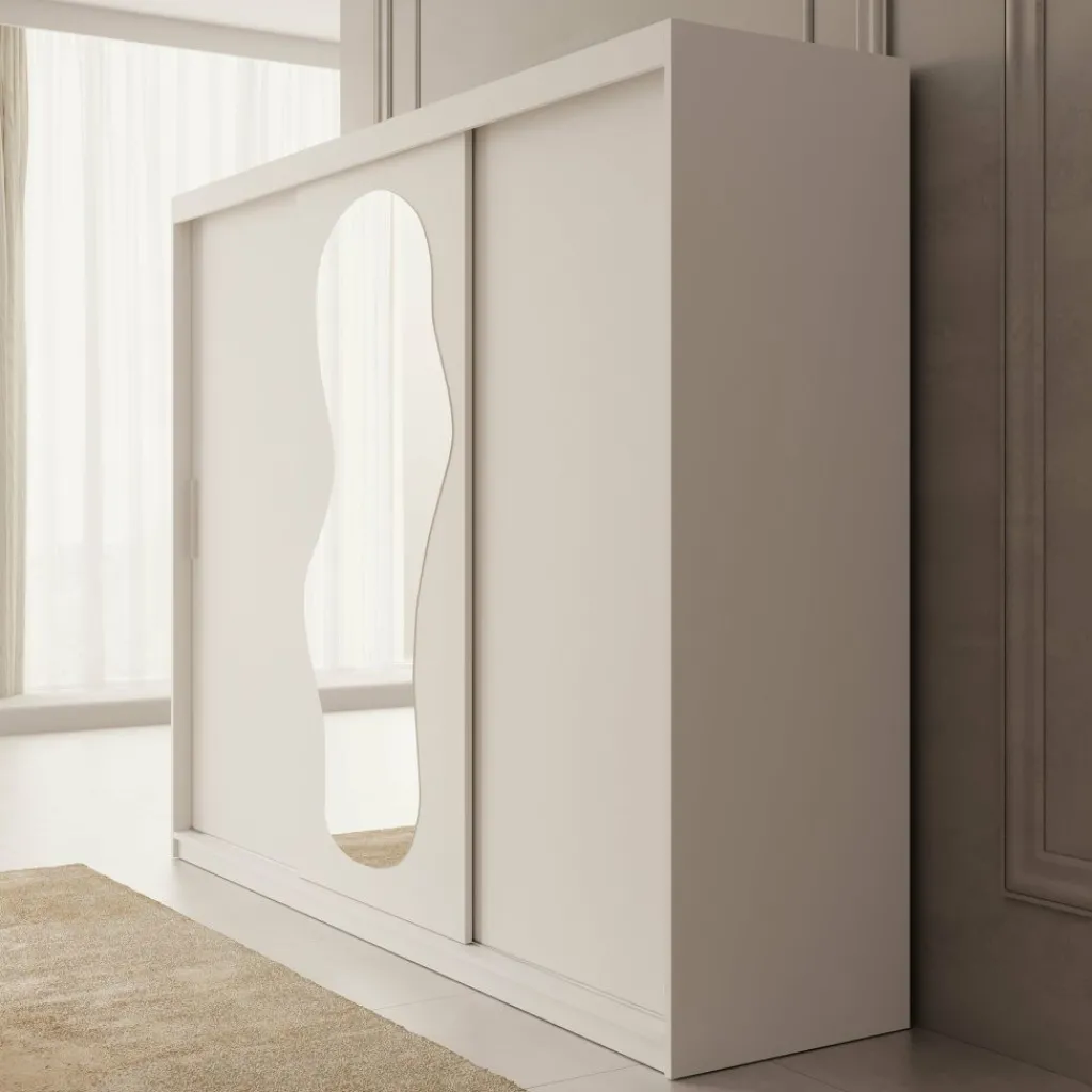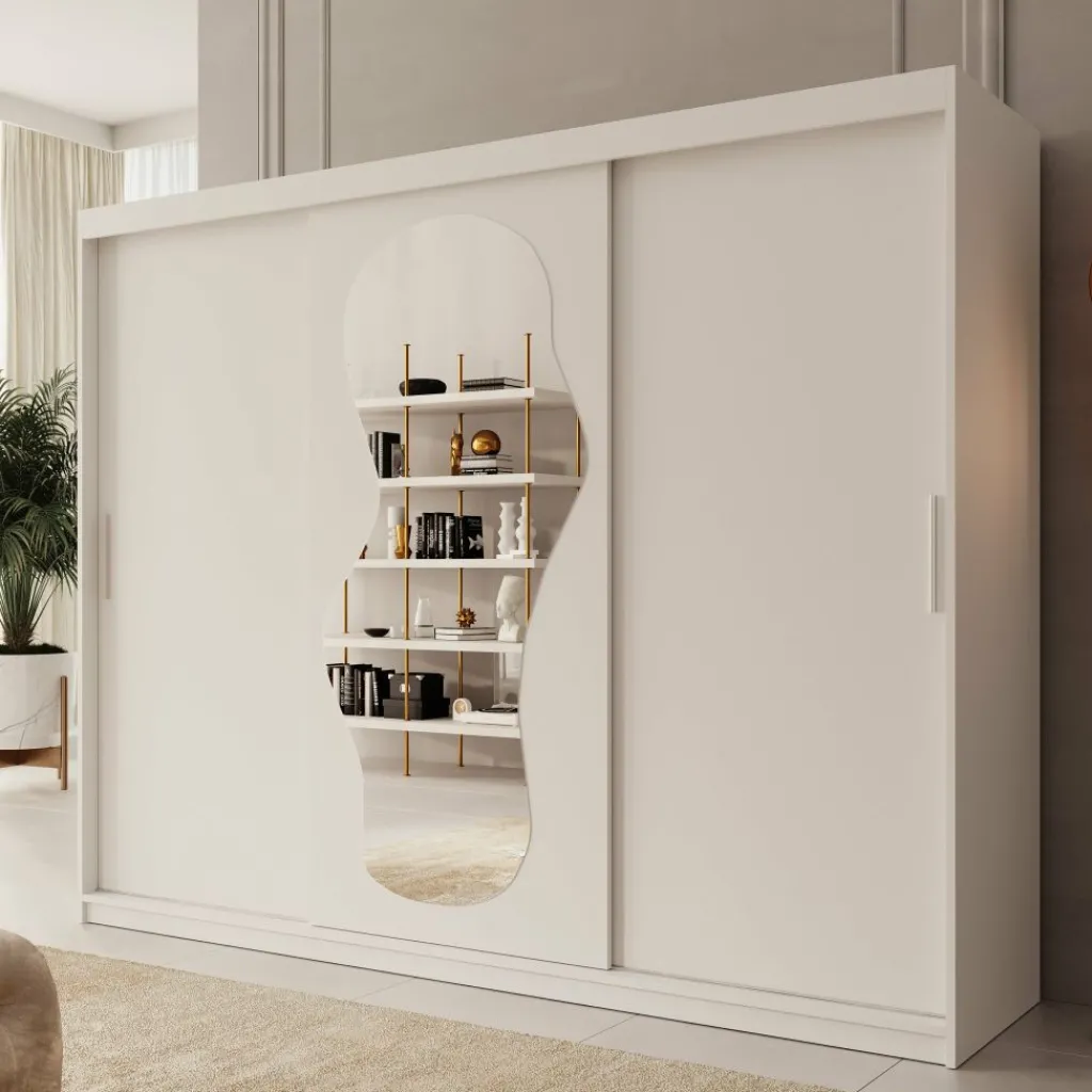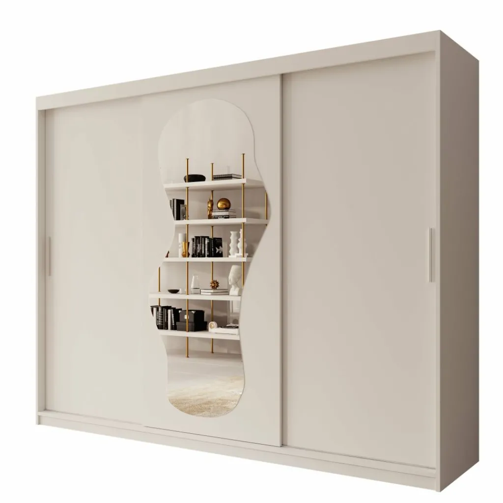 Met zijn strakke lijnen en frisse witte kleur past de kledingkast Ulysses in elk interieur. De drie schuifdeuren openen soepel en zijn afgewerkt met subtiele zilverkleurige handgrepen. De middelste deur is voorzien van een organisch gevormde spiegel die niet alleen functioneel is, maar ook een stijlvolle blikvanger vormt. Achter de deuren vind je volop ruimte om kleding overzichtelijk op te bergen: twee brede kledingroedes voor hangkleding en tien open vakken voor bijvoorbeeld truien, jeans of beddengoed.