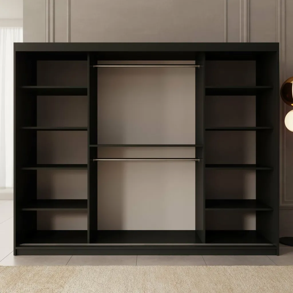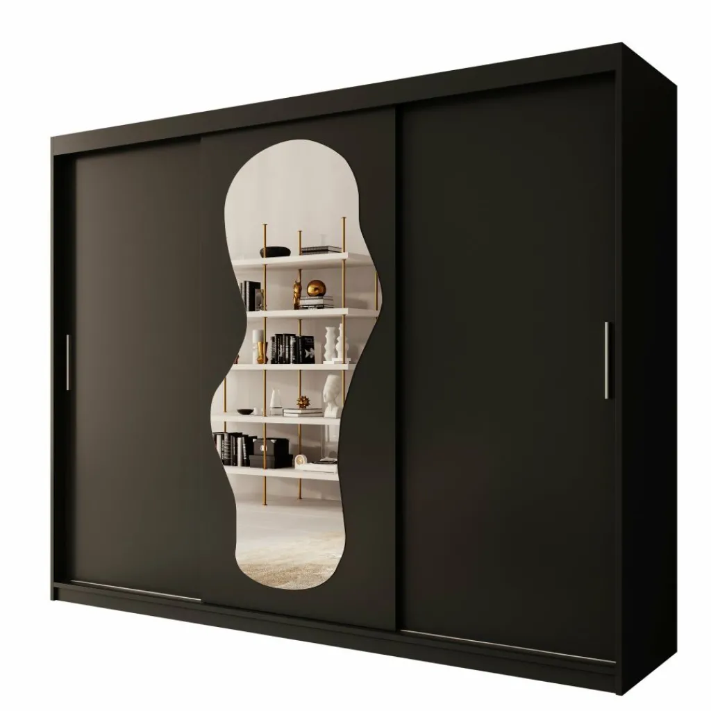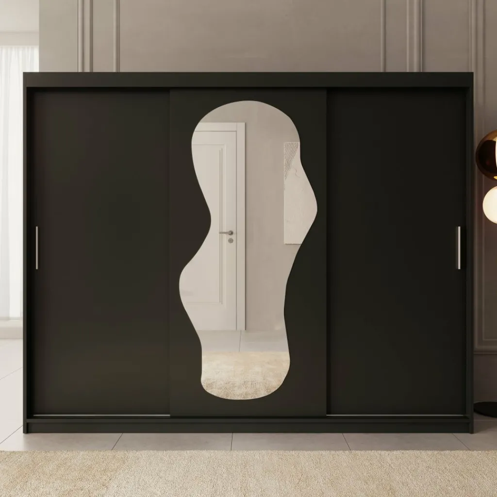 Met zijn strakke lijnen en diepzwarte kleur past de kledingkast Ulysses in elk interieur. De drie schuifdeuren openen soepel en zijn afgewerkt met subtiele zilverkleurige handgrepen. De middelste deur is voorzien van een organisch gevormde spiegel die niet alleen functioneel is, maar ook een stijlvolle blikvanger vormt. Achter de deuren vind je volop ruimte om kleding overzichtelijk op te bergen: twee brede kledingroedes voor hangkleding en tien open vakken voor bijvoorbeeld truien, jeans of beddengoed.