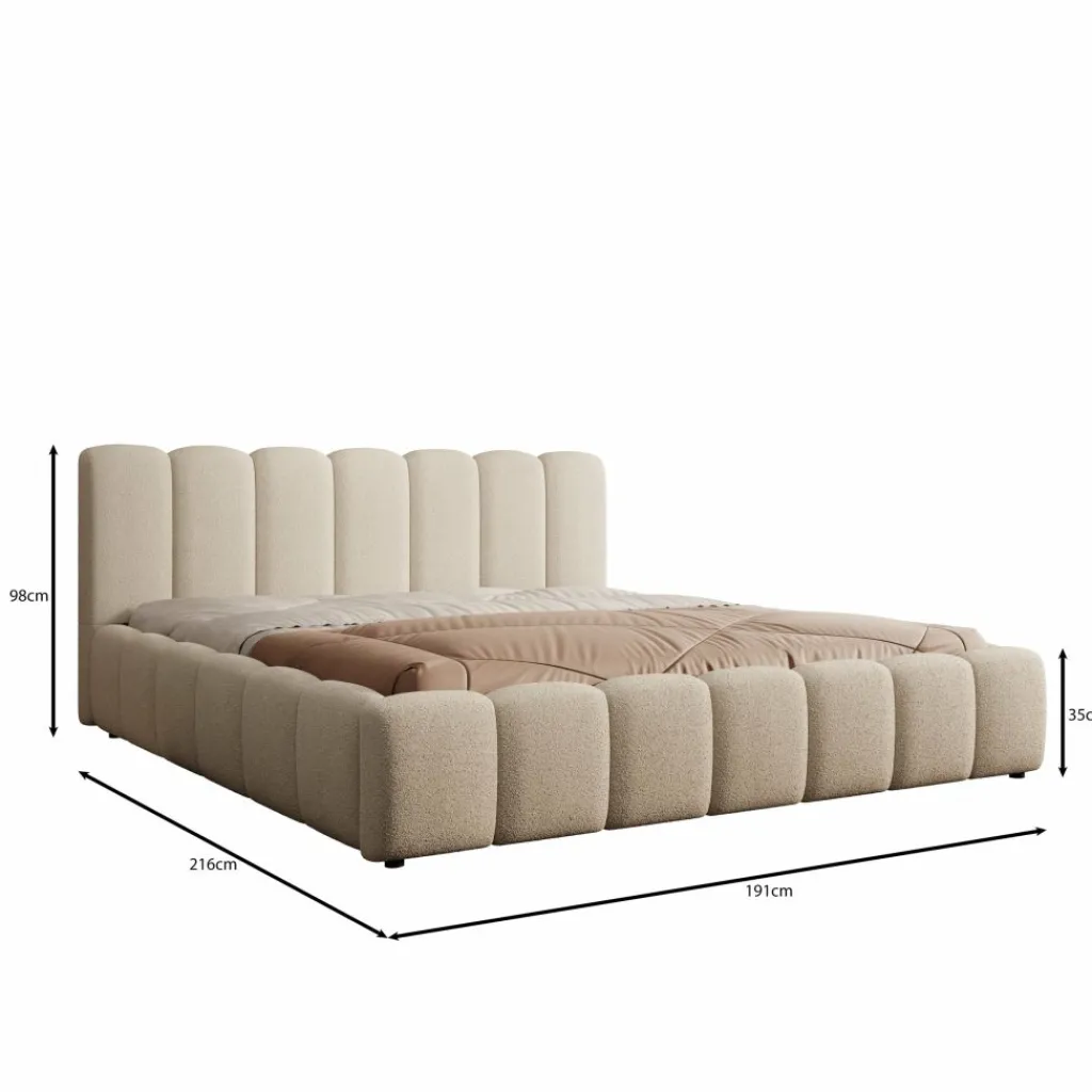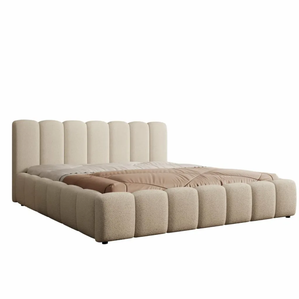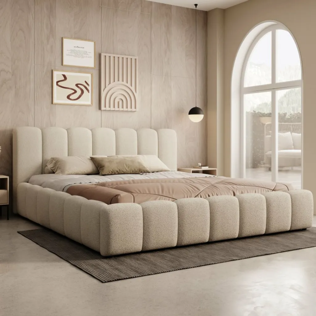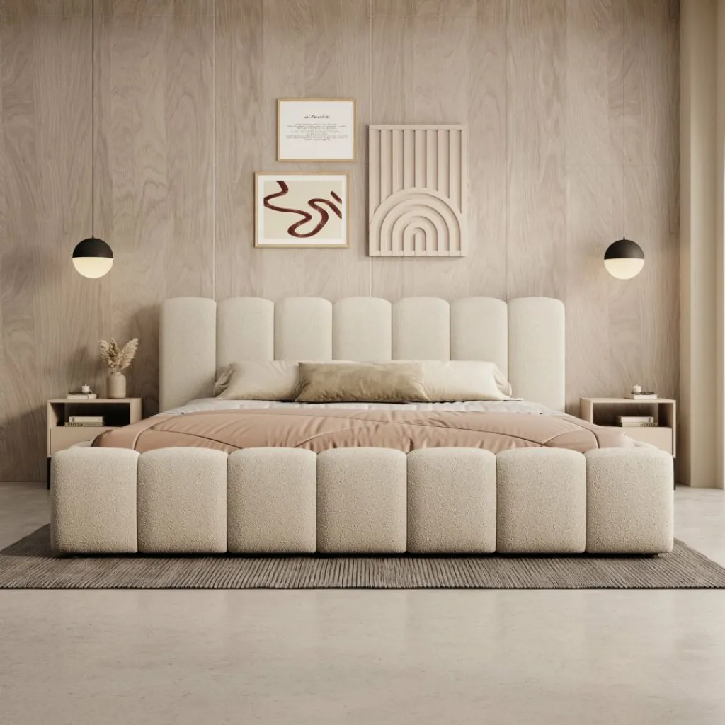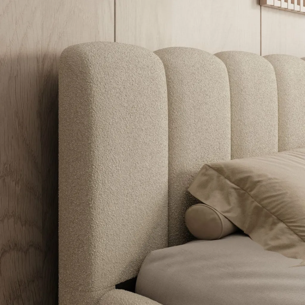 Het Valerio bed in beige teddystof is uitgevoerd in een royale 180×200 cm maat en heeft een karakteristiek blokvormig ontwerp. Het hoofdbord bestaat uit verticale panelen die het bed een strakke en evenwichtige uitstraling geven. De teddystof heeft een zachte structuur die zorgt voor een gelijkmatig en verzorgd geheel.
