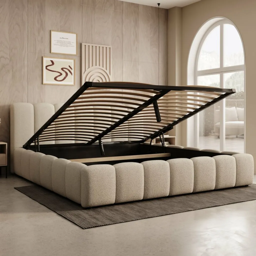 Onder het bed bevindt zich een ruime opbergbox, toegankelijk via een liftmechanisme met gasveren. De lattenbodem kan gecontroleerd omhoog worden gebracht, waardoor de volledige opbergruimte beschikbaar komt. Deze ruimte is geschikt voor beddengoed, kussens of seizoensartikelen. Het mechanisme werkt soepel en blijft licht te bedienen.