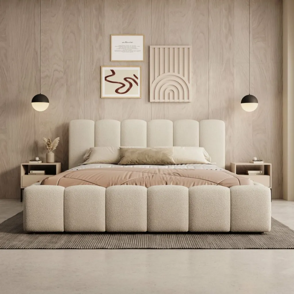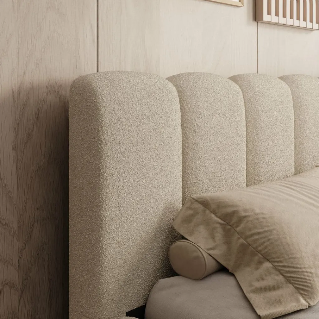 Het Valerio bed in beige teddystof heeft een blokvormige omlijsting en een hoog hoofdbord dat is opgebouwd uit verticale panelen. De teddystof heeft een volle structuur die het bed een gelijkmatige en rustige uitstraling geeft. Het frame is geschikt voor een matras van 160×200 cm en vormt een stabiele basis voor dagelijks gebruik.