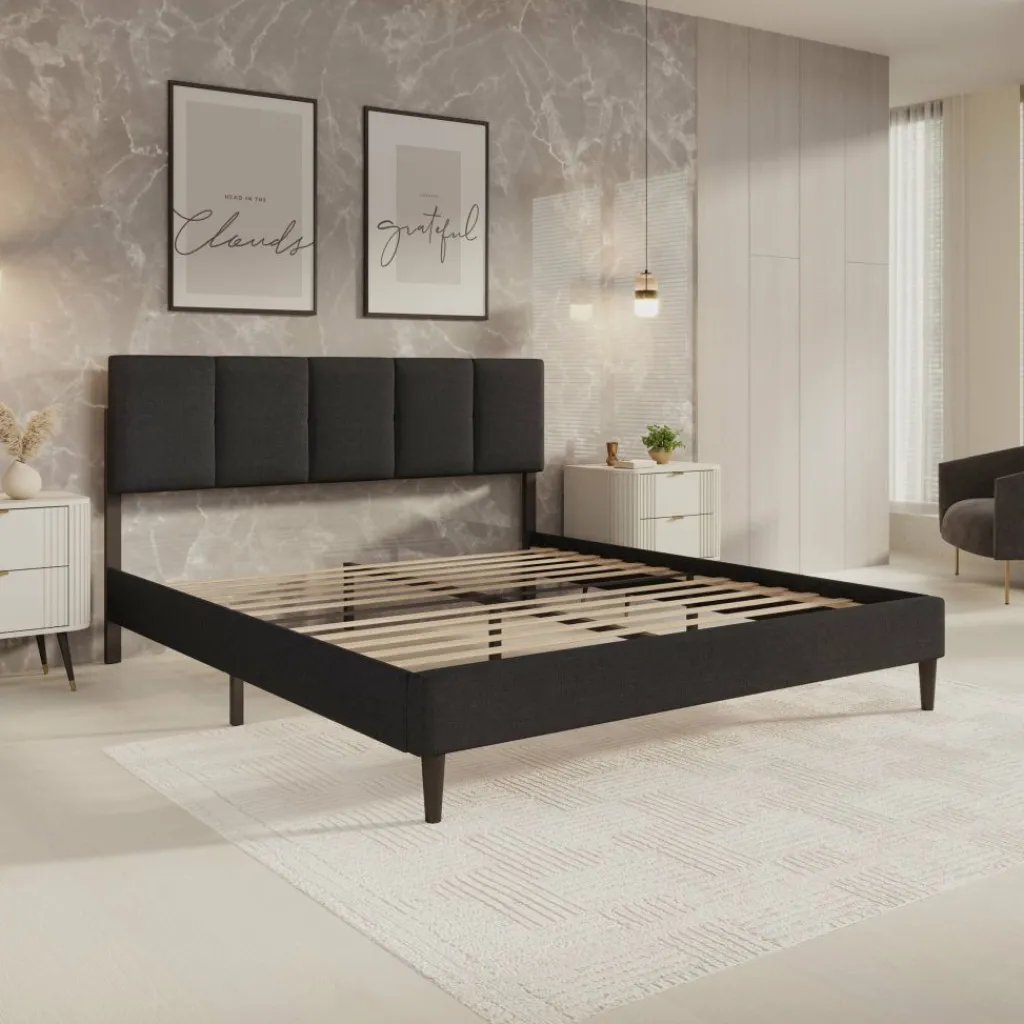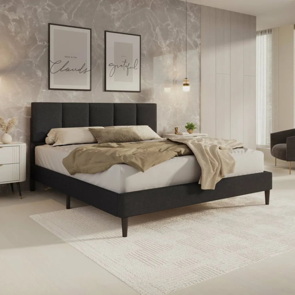 Het Varell bed in 180×200 cm biedt extra ruimte en behoudt dezelfde strakke vormgeving als de andere varianten. De zwarte stoffering zorgt voor een neutrale basis die eenvoudig te combineren is met verschillende interieurstijlen. Het hoofdbord is voorzien van verticale banen, wat het ontwerp een duidelijke en moderne uitstraling geeft.