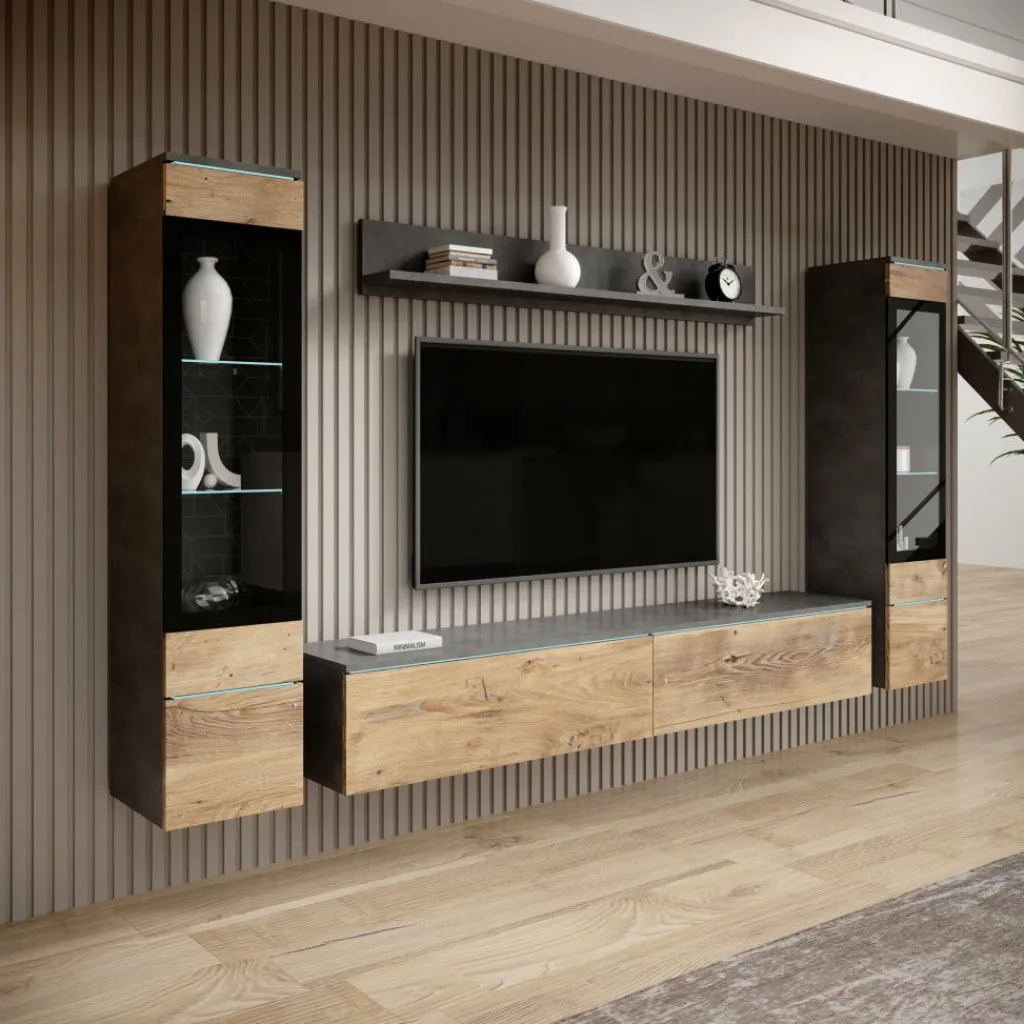 Het meubel bestaat uit meerdere delen, waaronder vitrinekasten met glazen planken, een tv-meubel en een wandplank. Dankzij de slimme indeling is er voldoende ruimte voor zowel decoratie als opberging. De combinatie van materialen en kleuren maakt dit wandmeubel een elegante toevoeging aan een modern of industrieel interieur.