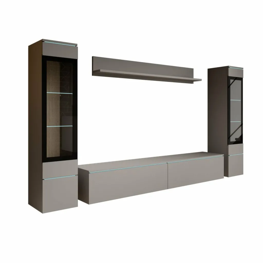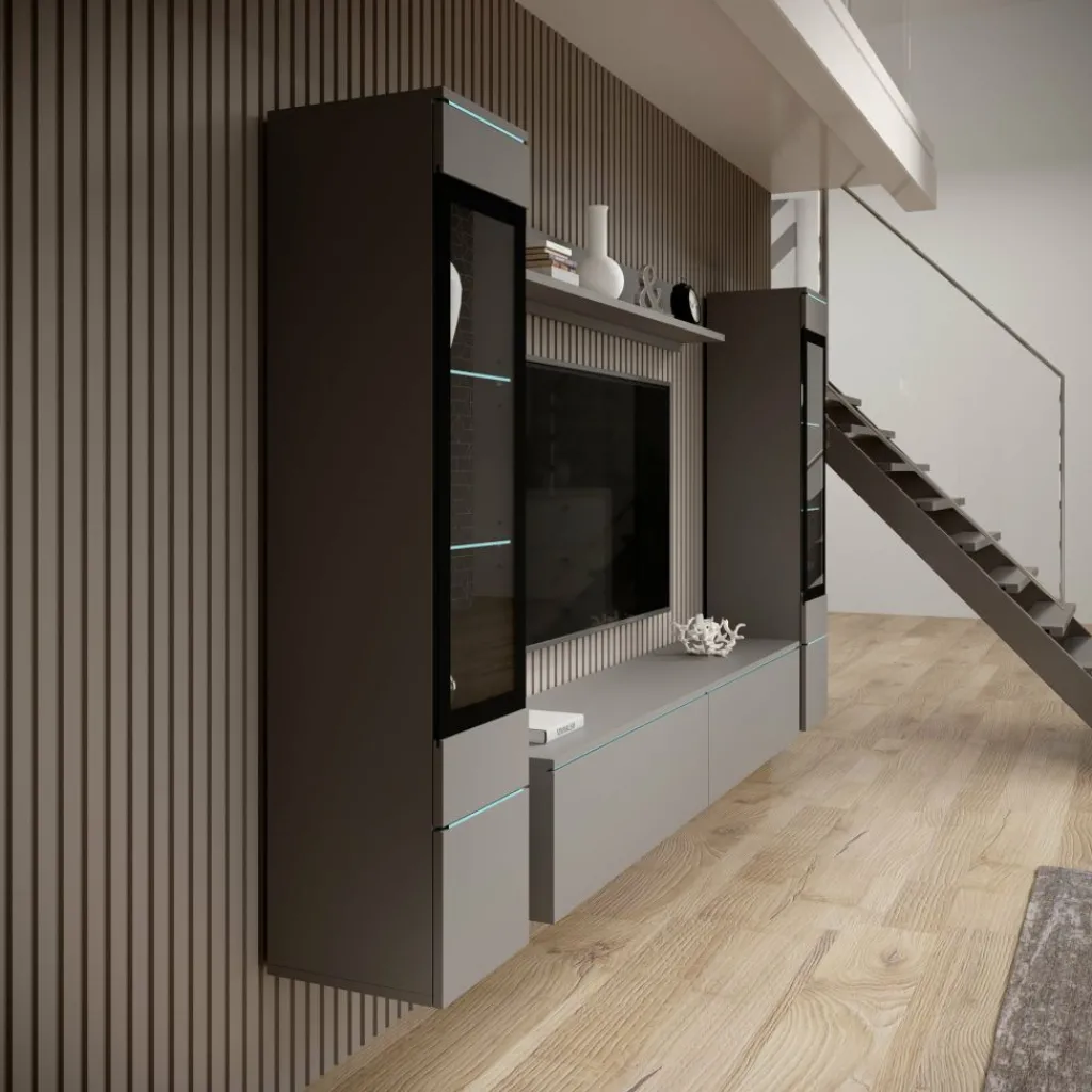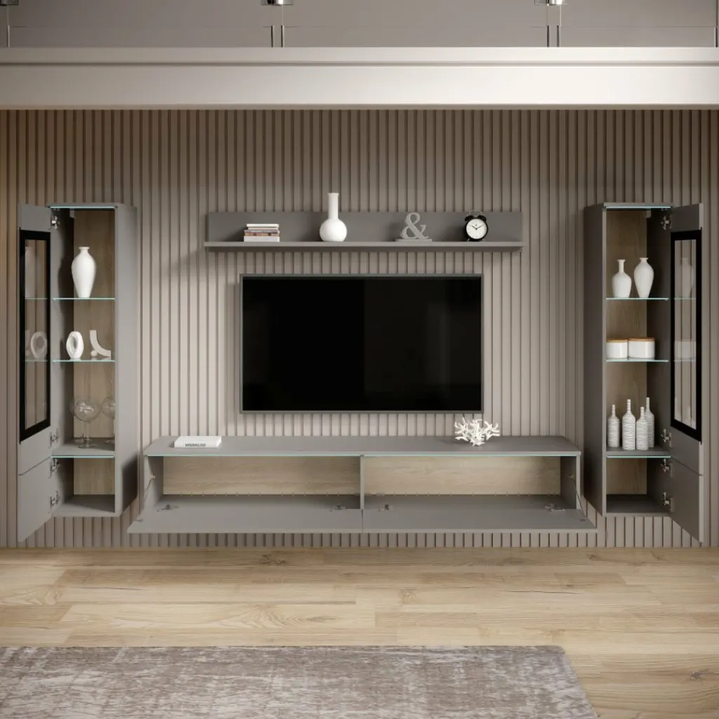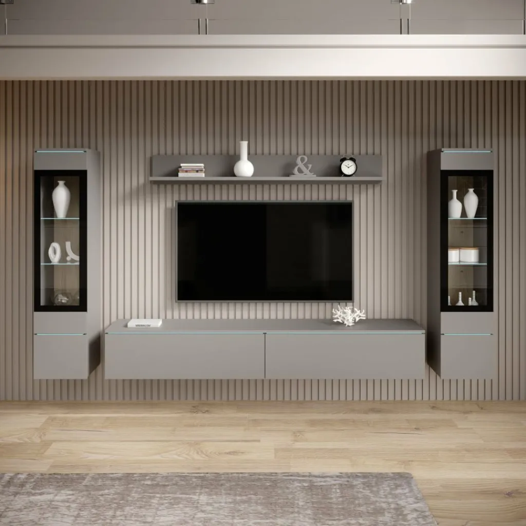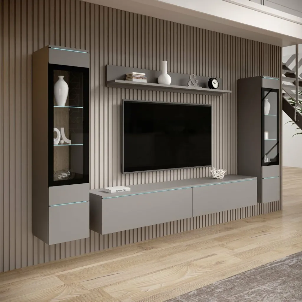 De Variety wandmeubel in grijs combineert een moderne uitstraling met praktische opbergruimte. Het meubel bestaat uit meerdere onderdelen, waaronder vitrinekasten met glazen planken, een tv-meubel en een wandplank.