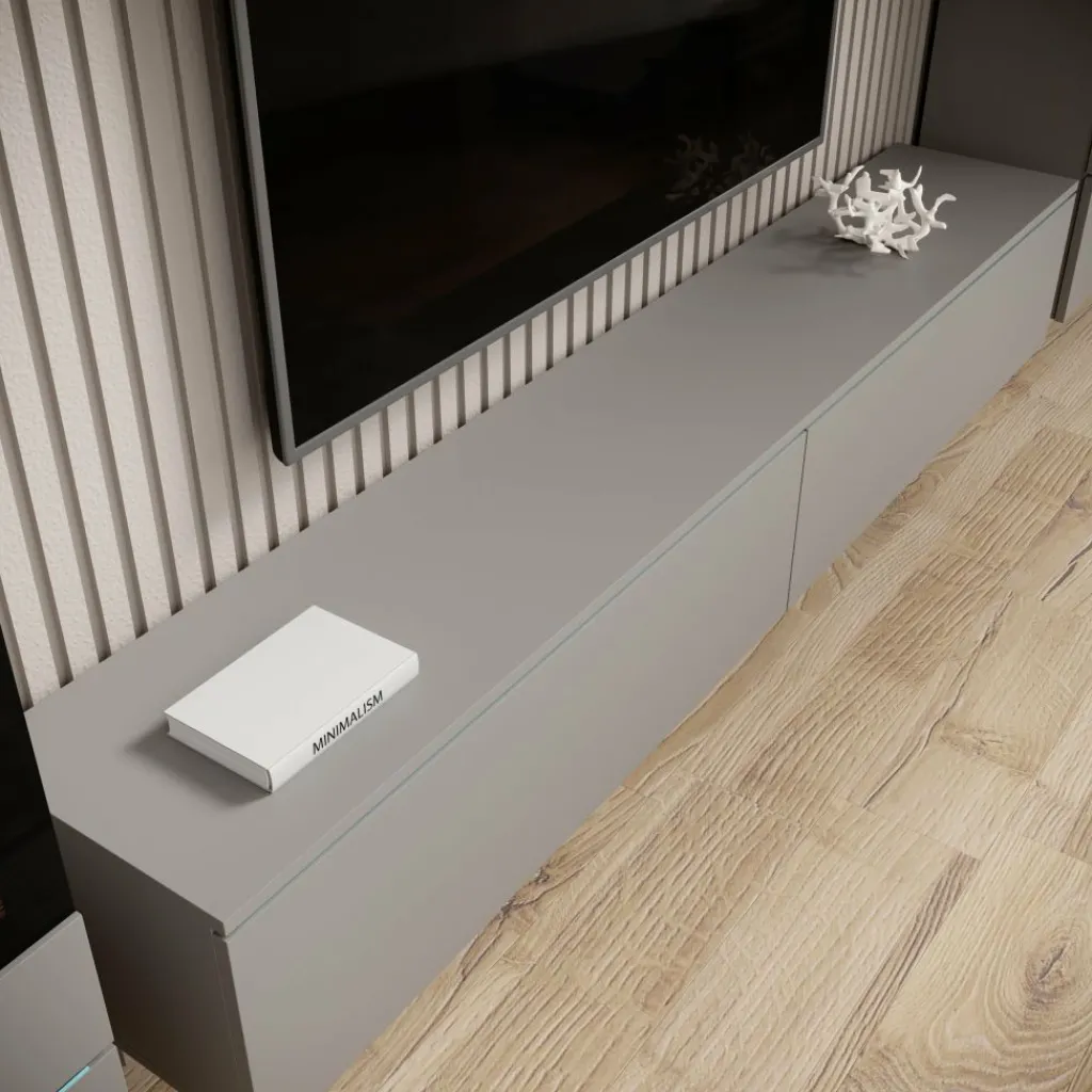 De grijze kleur zorgt voor een stijlvolle, eigentijdse look die moeiteloos past in verschillende interieurs. Dankzij de combinatie van gesloten en open vakken biedt het meubel ruimte voor zowel decoratie als apparatuur en accessoires, waardoor de woonkamer netjes en in balans oogt.