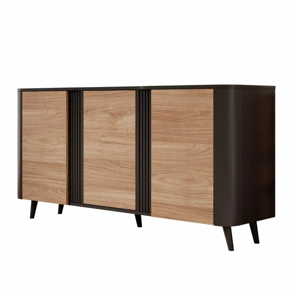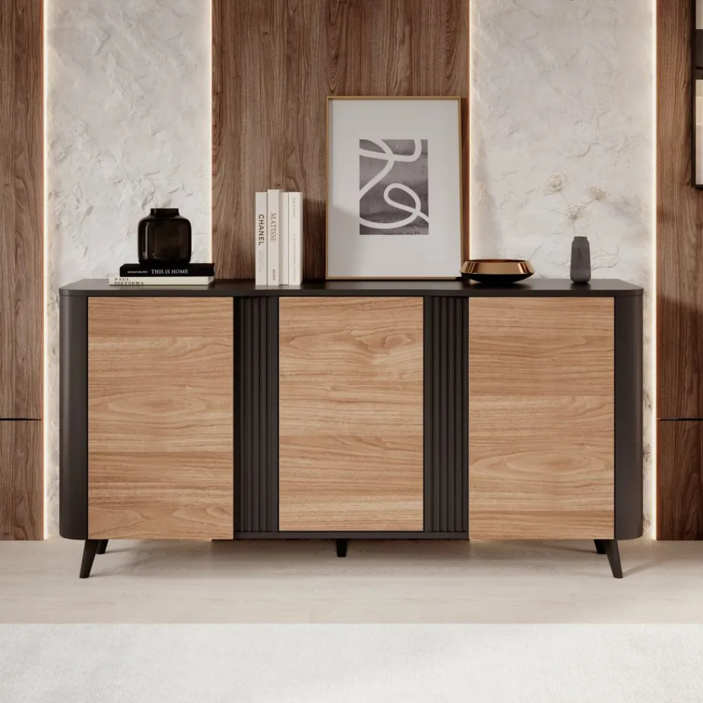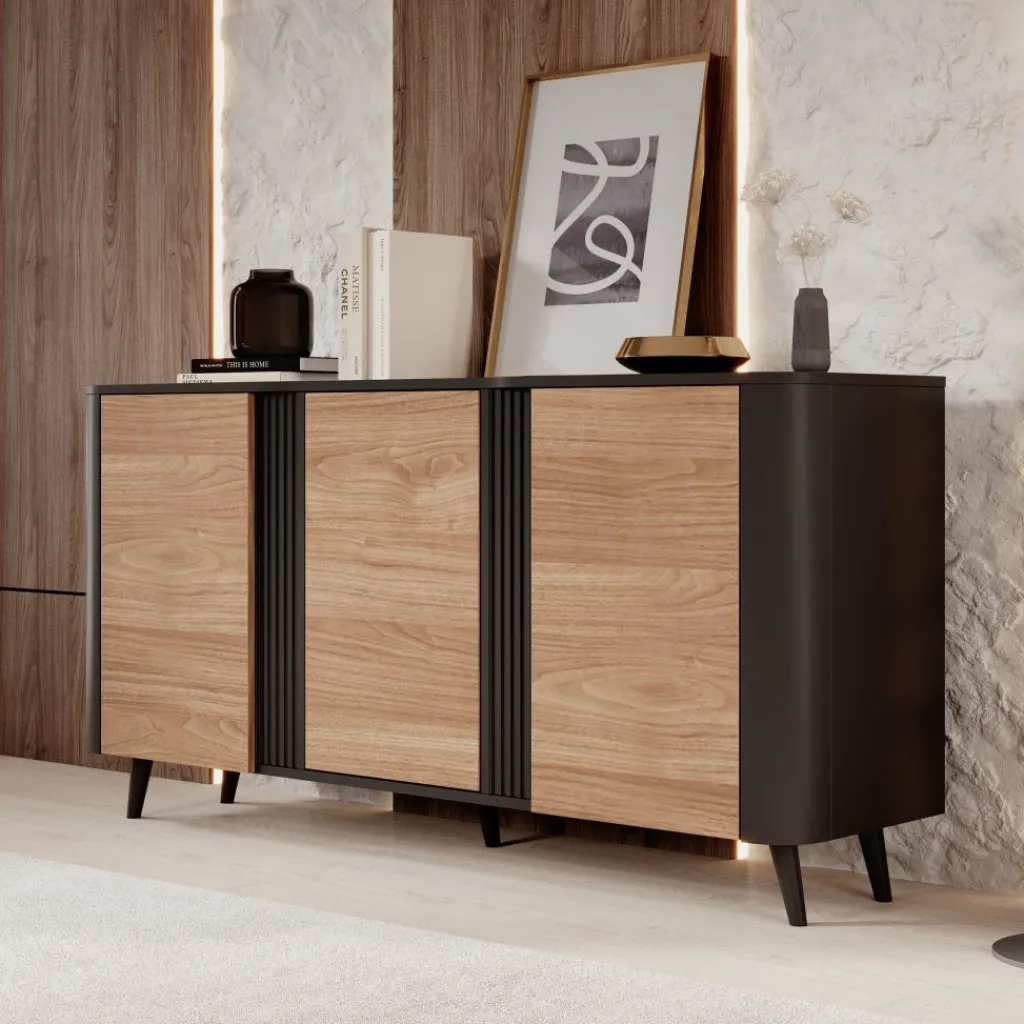 De Veda dressoir in zwart/eiken combineert moderne elegantie met de warme uitstraling van hout. De deuren in natuurlijke eikenlook steken prachtig af tegen de matzwarte kast en geven het meubel een stijlvol en tijdloos karakter. Dankzij het strakke lijnenspel en de subtiele details is dit dressoir een echte blikvanger in jouw interieur.