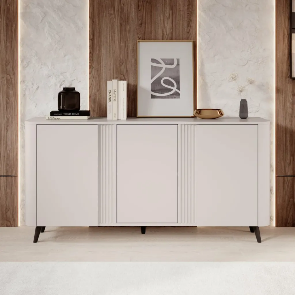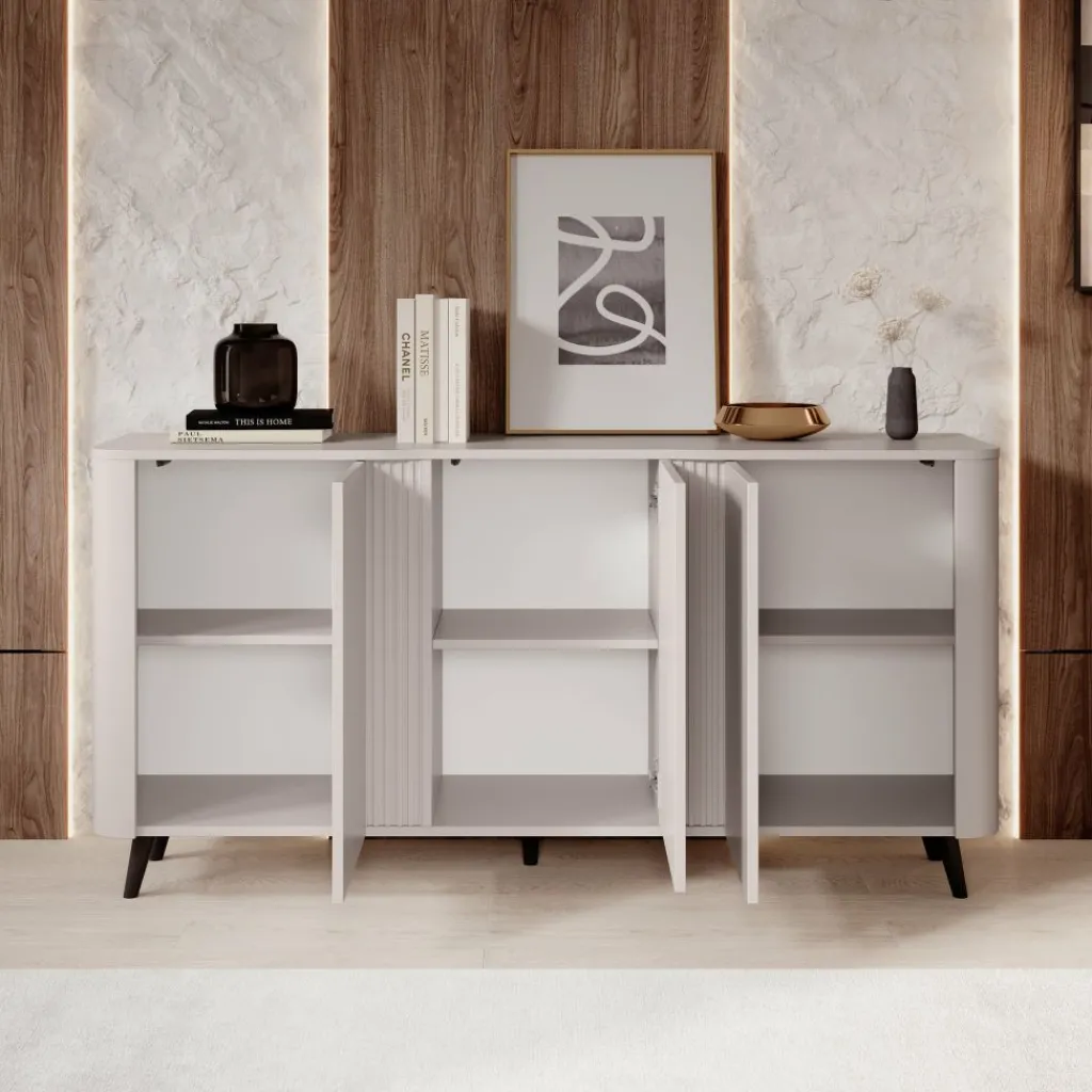 Naast zijn functionaliteit is het Veda dressoir ook een echte blikvanger. Het strakke front, gecombineerd met de afgeronde hoeken en zwarte poten, zorgt voor een speelse maar toch moderne uitstraling. Plaats er decoratieve accessoires, een lamp of fotolijsten op om een persoonlijke sfeer te creëren.
