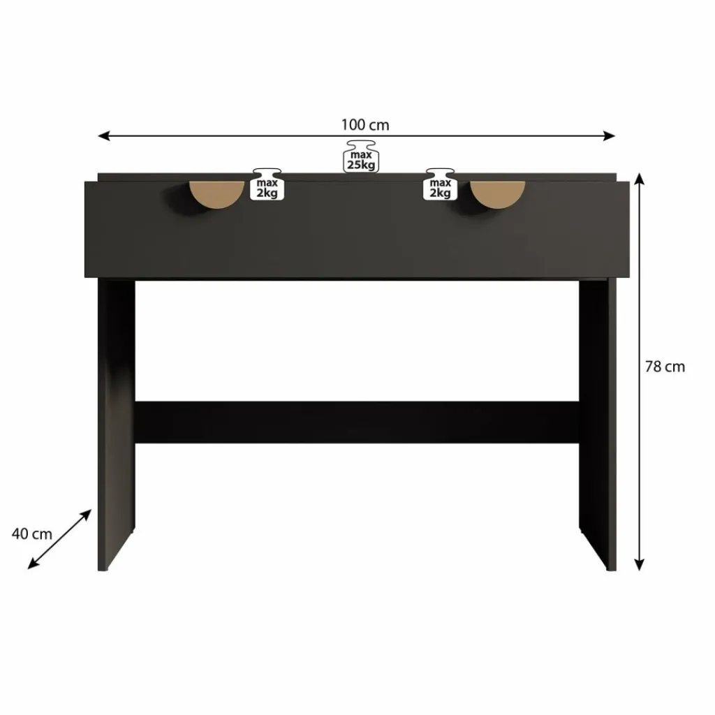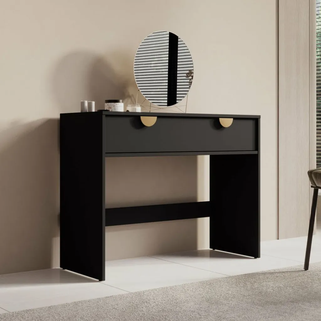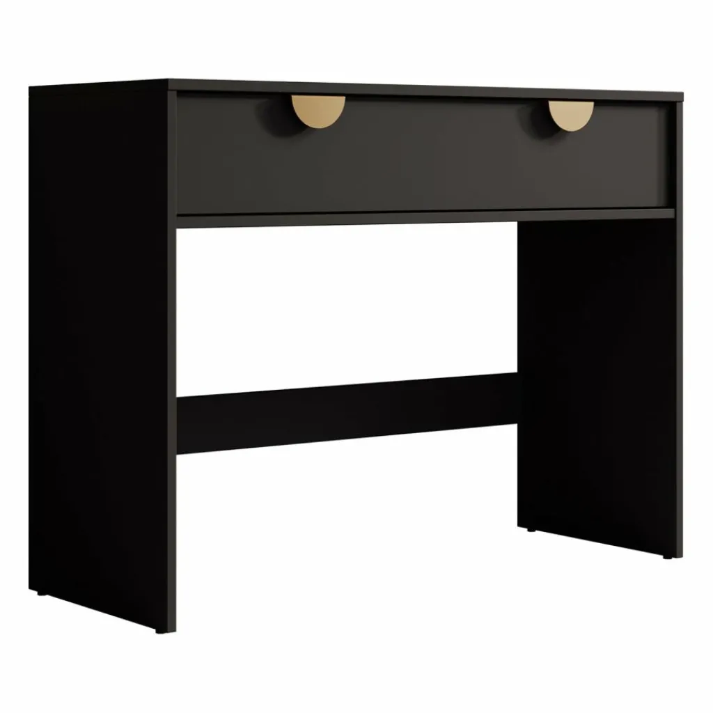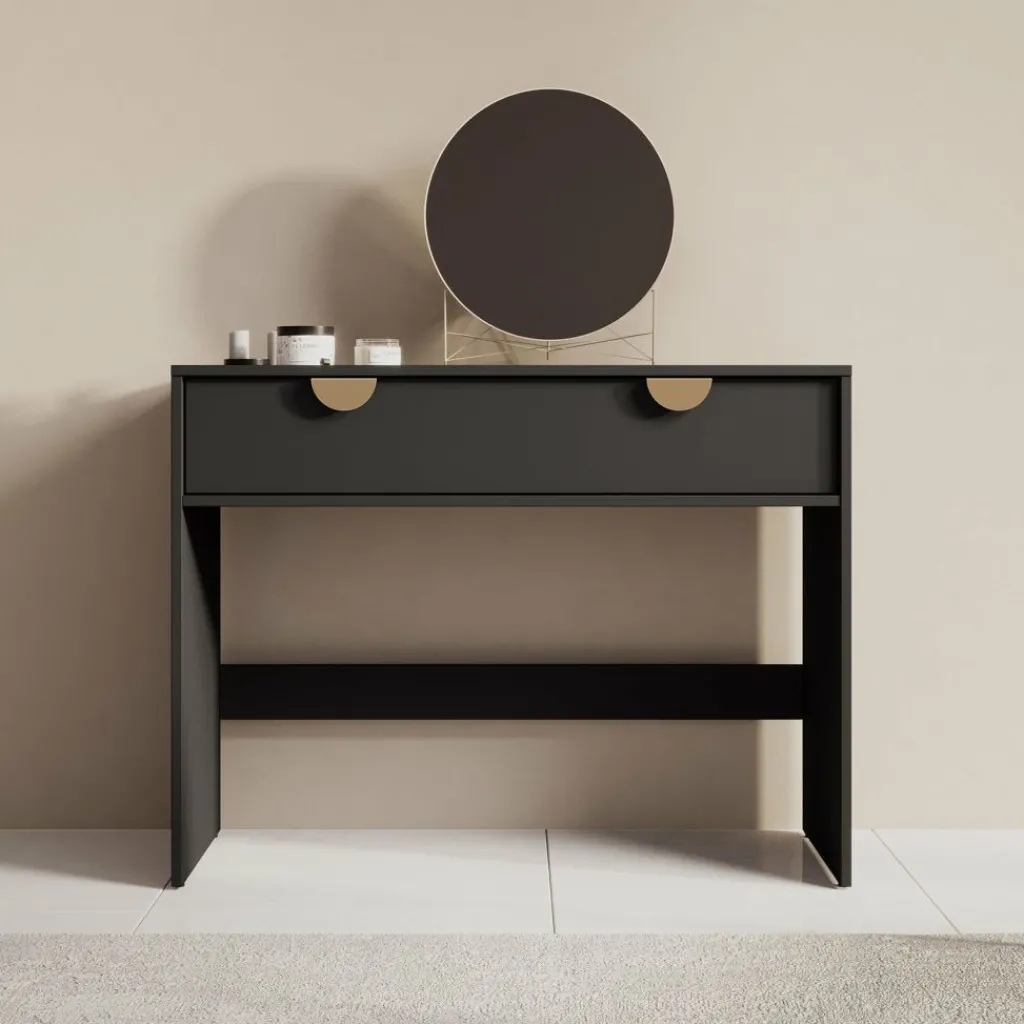 Kaptafel Veerle is een make-up tafel in modern, hotel chique stijl. De kaptafel beschikt over 2 lades die openen met goudkleurige handgrepen. De rest van het meubel is afgewerkt in een mat zwarte kleur.