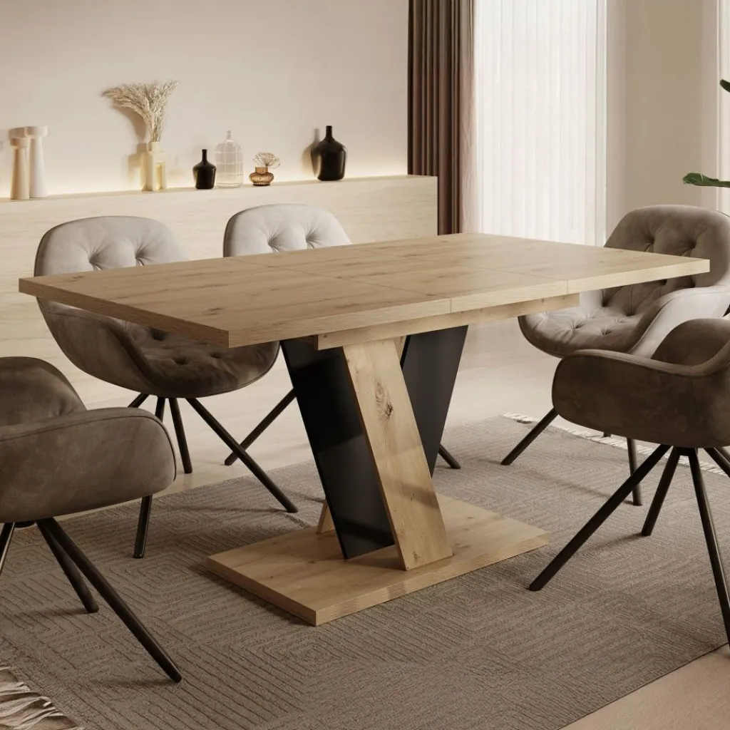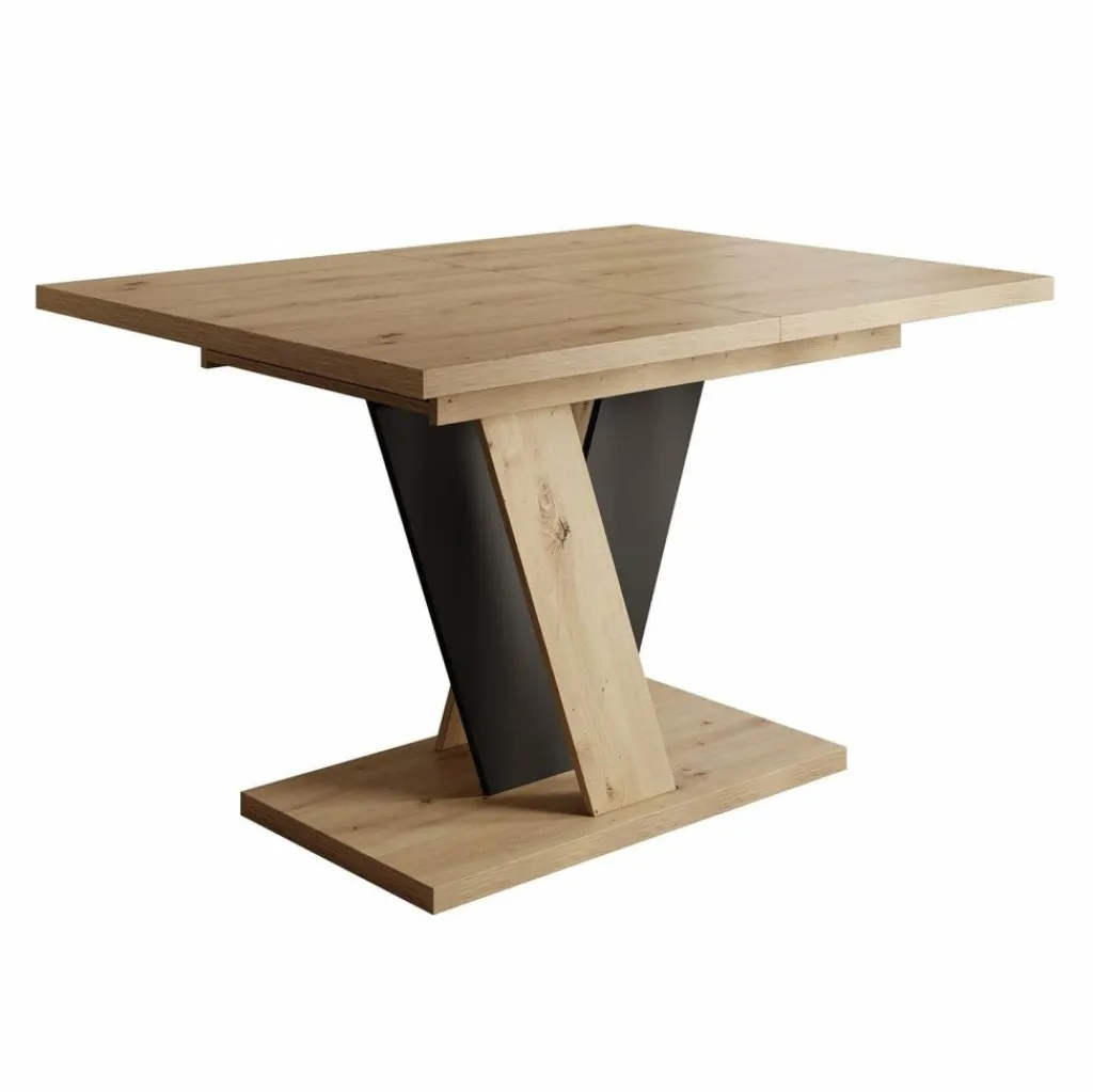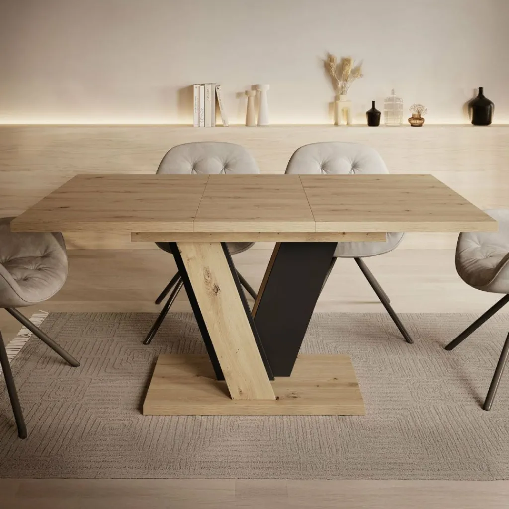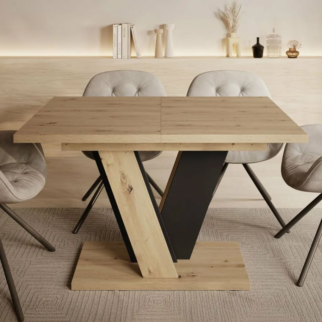 Het uitschuiven van de tafel werkt als volgt: in het frame zit een rails waaraan de twee uiteinden van de tafel zijn bevestigd. Je trekt beide uiteinden een beetje naar buiten en haalt het middenstuk ertussenuit. Dit deel kan je opbergen in de ruimte onder het tafelblad. Vervolgens duw je de twee uiteinden weer naar het midden en bevestigt deze aan elkaar d.m.v. de haakjes onder het tafelblad.
