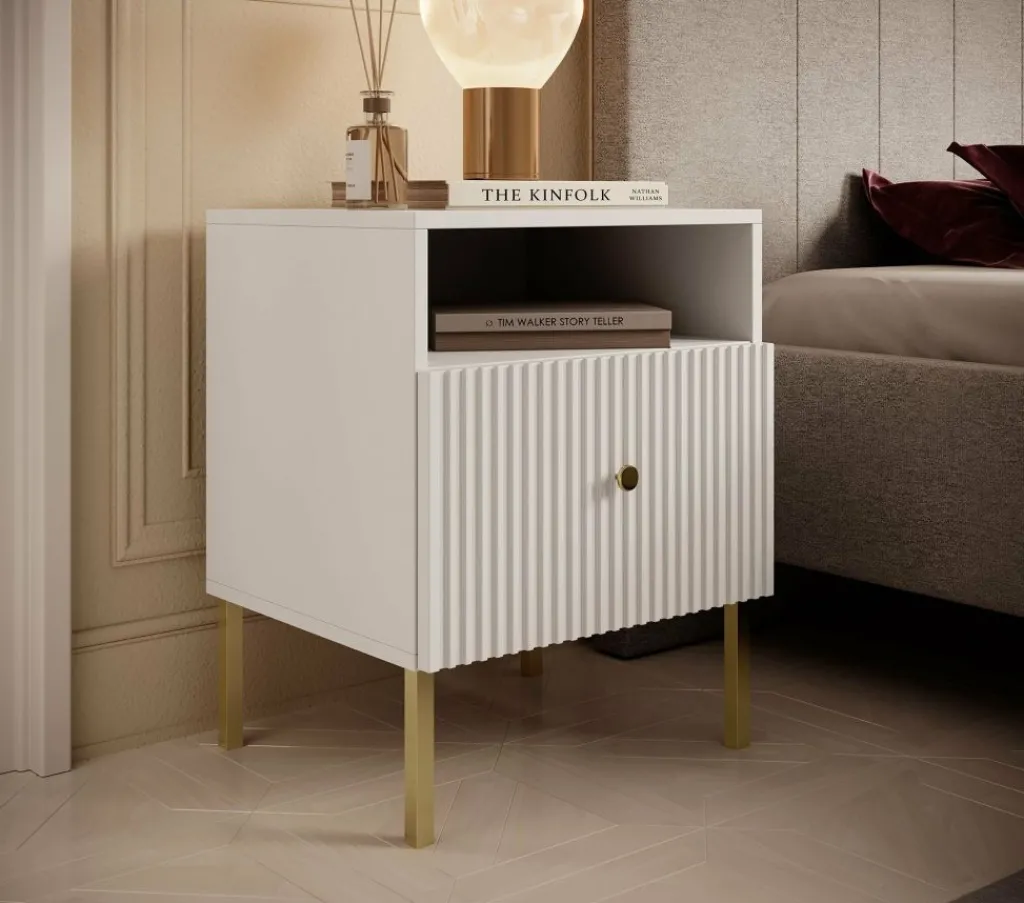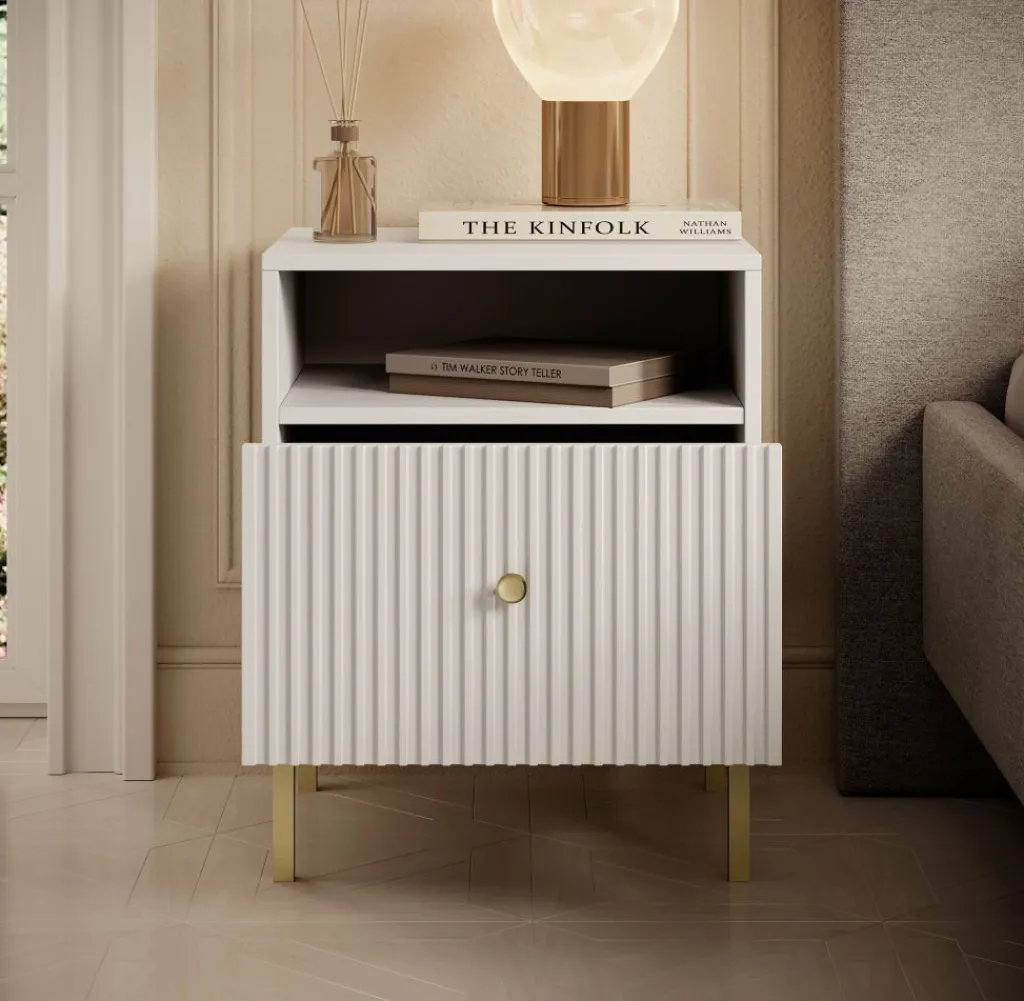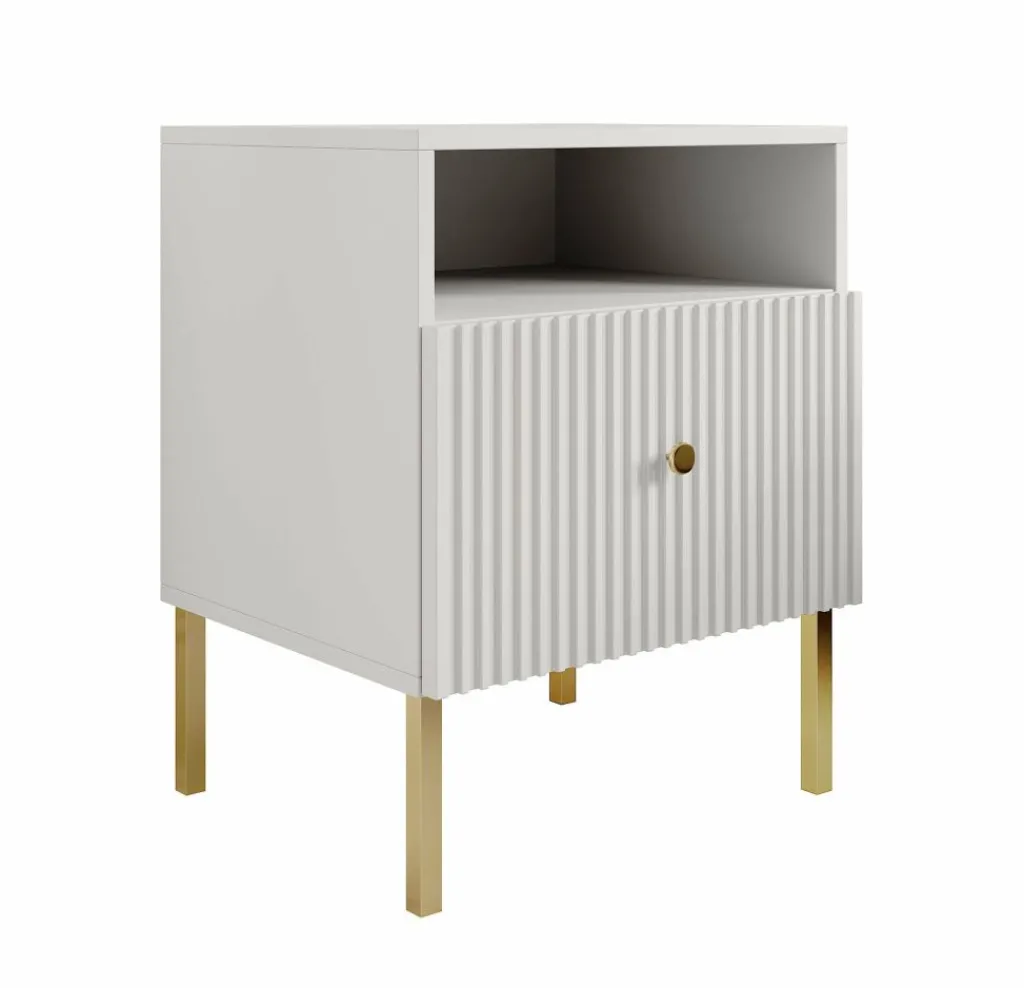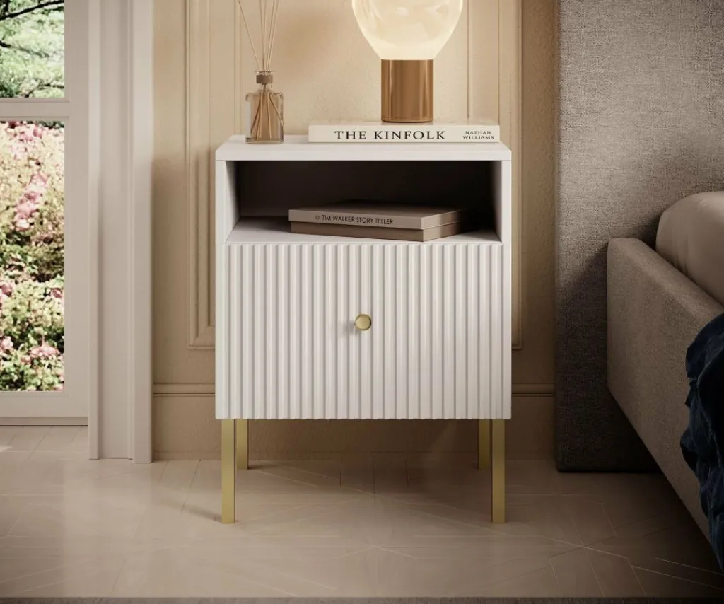 De Vermont beschikt over 1 lade die via een goudkleurige knop te openen is. De voorkant van de lade heeft een lattenpatroon. Het nachtkastje staat op goudkleurige, hoge pootjes.