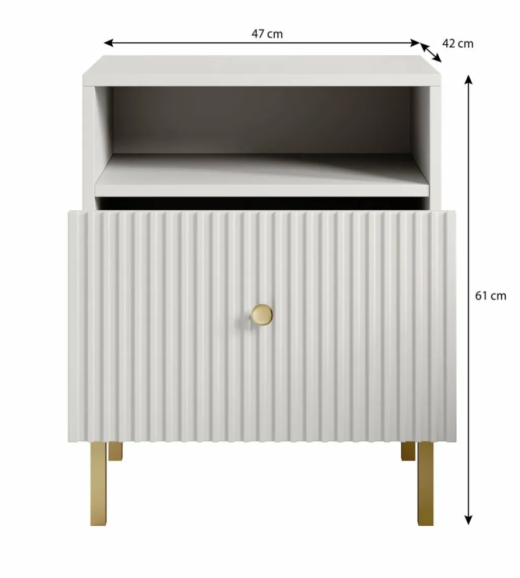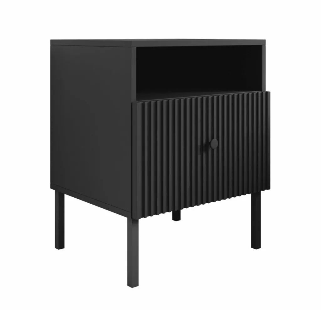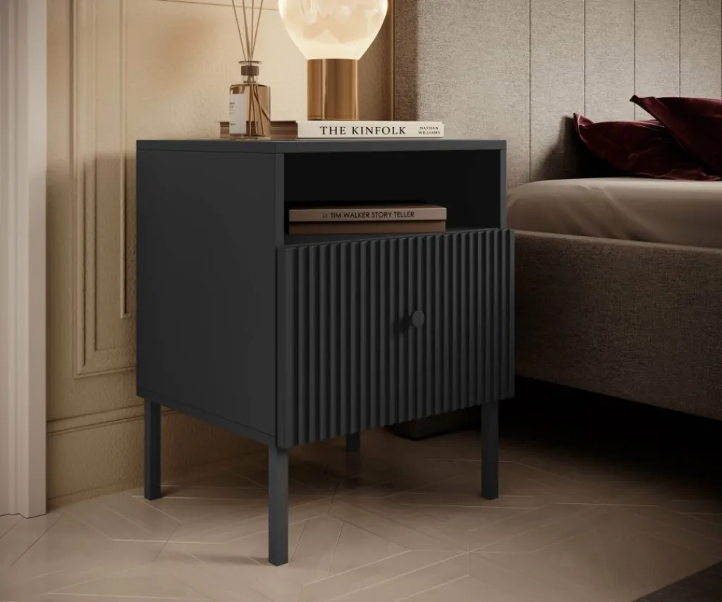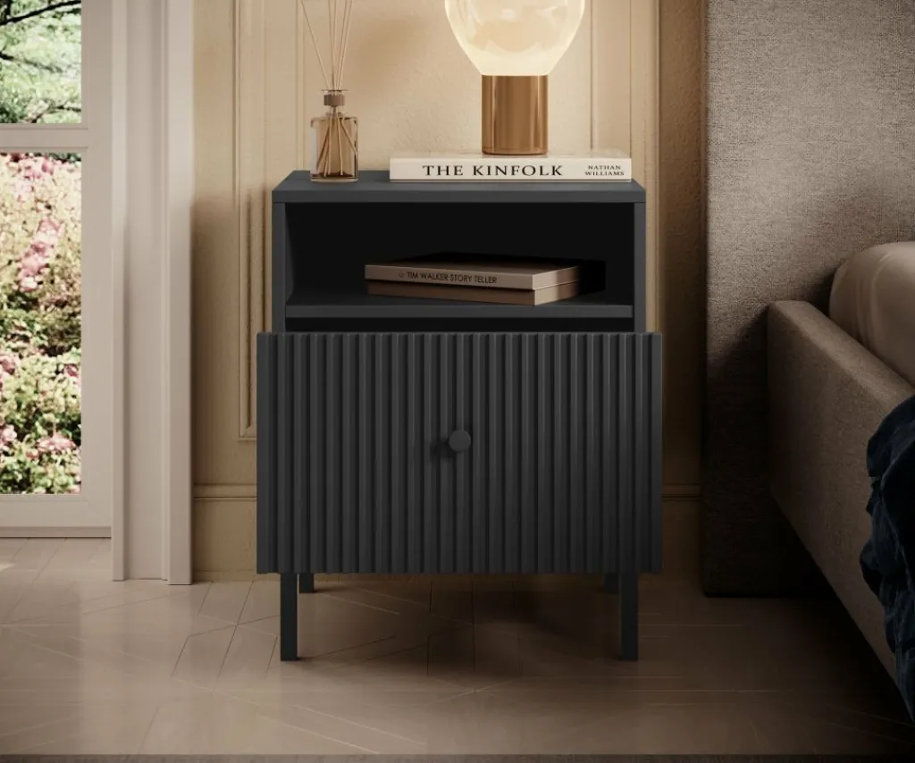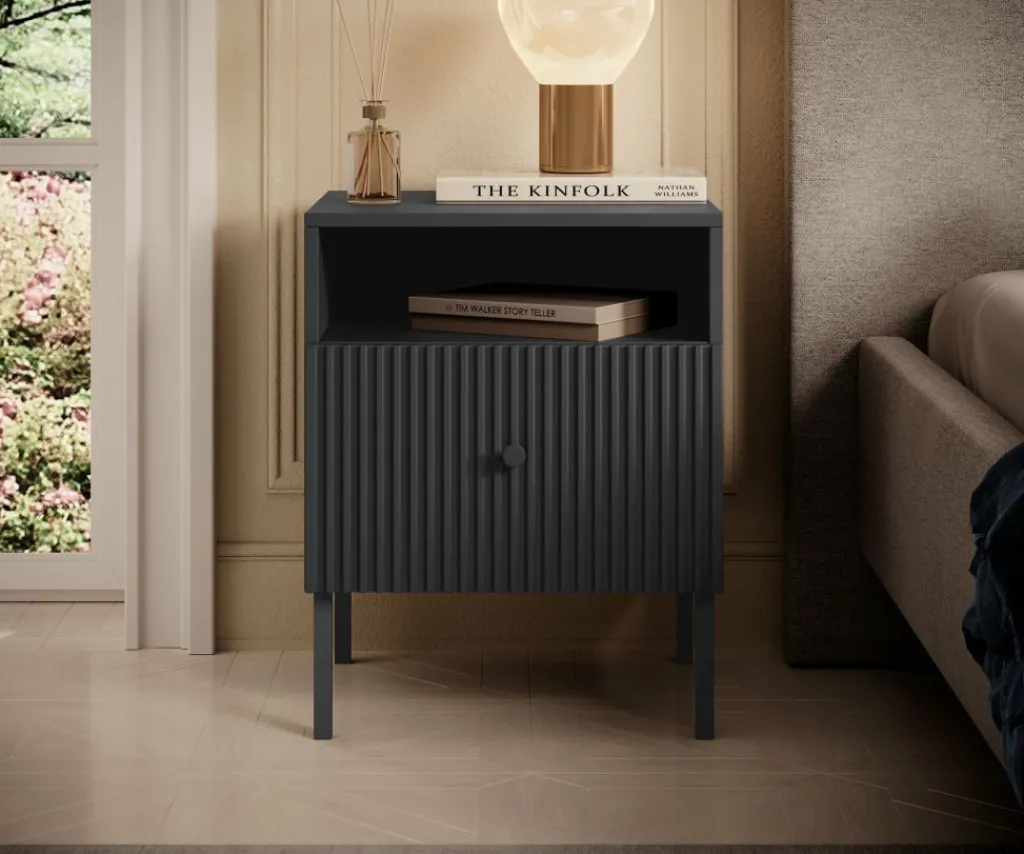 De Vermont beschikt over 1 lade die via een antracietkleurige knop te openen is. De voorkant van de lade heeft een lattenpatroon. Het nachtkastje staat op antracietkleurige, hoge pootjes.