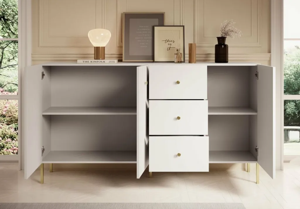 De kast heeft 3 deuren en 3 lades. Deze openen via goudkleurige knoppen. Achter de deuren zitten 4 opbergvakken. Op de voorkant van de deuren zitten latten.