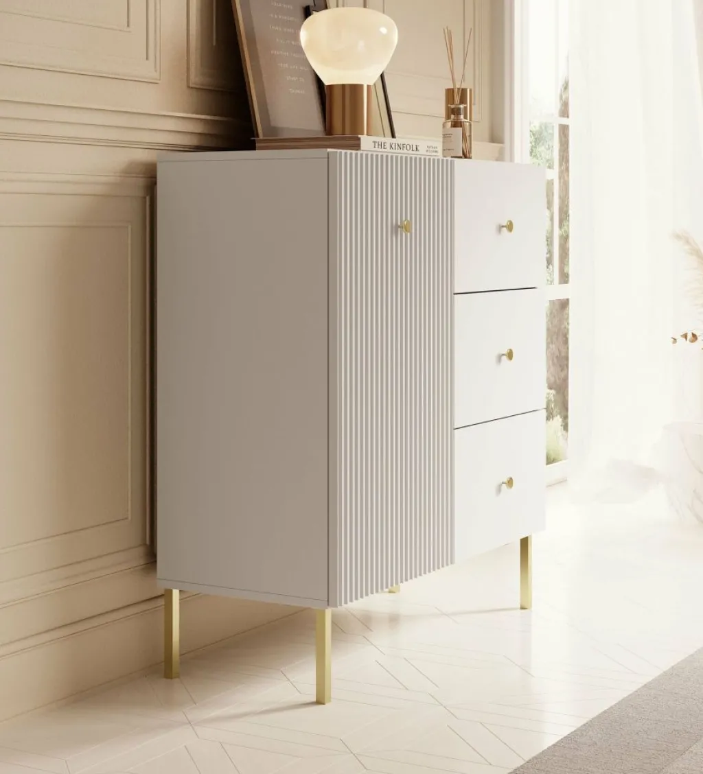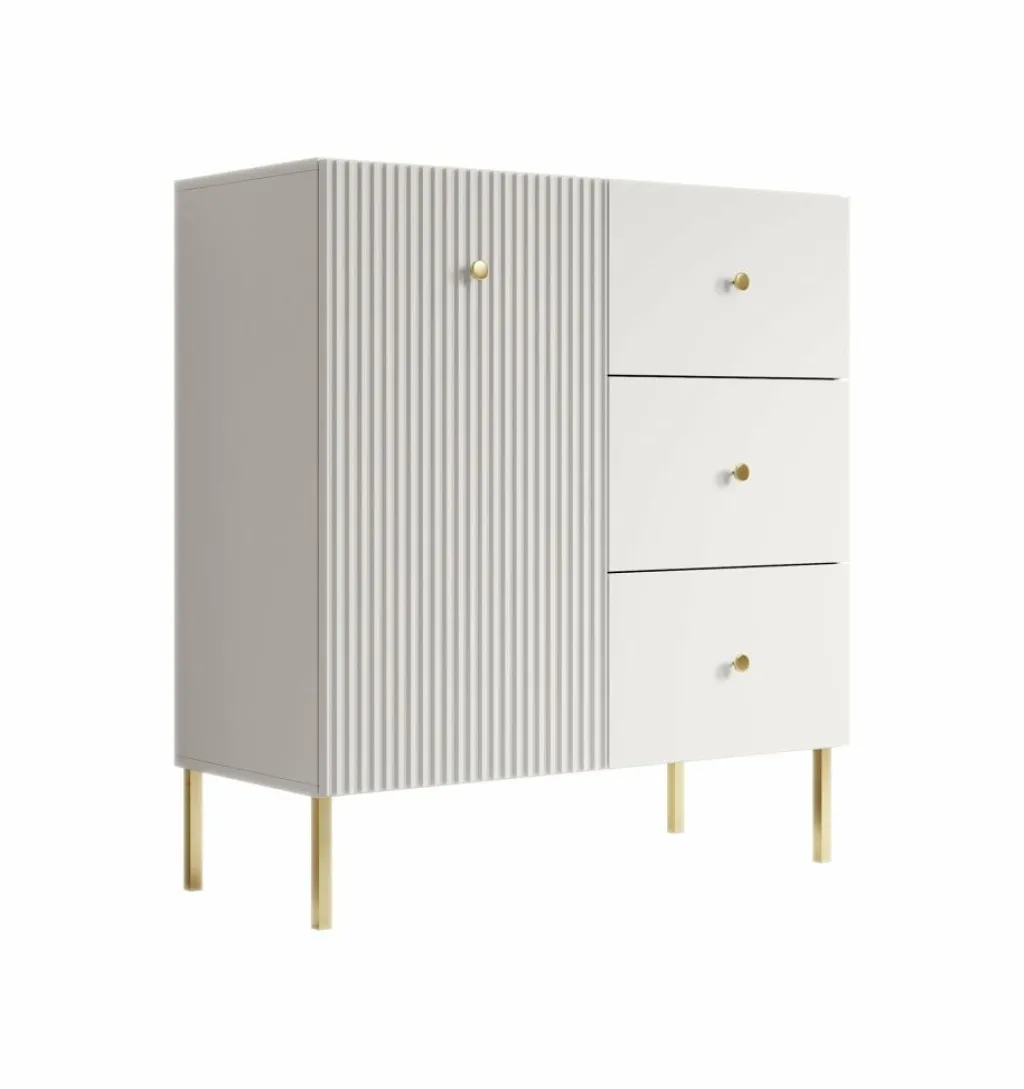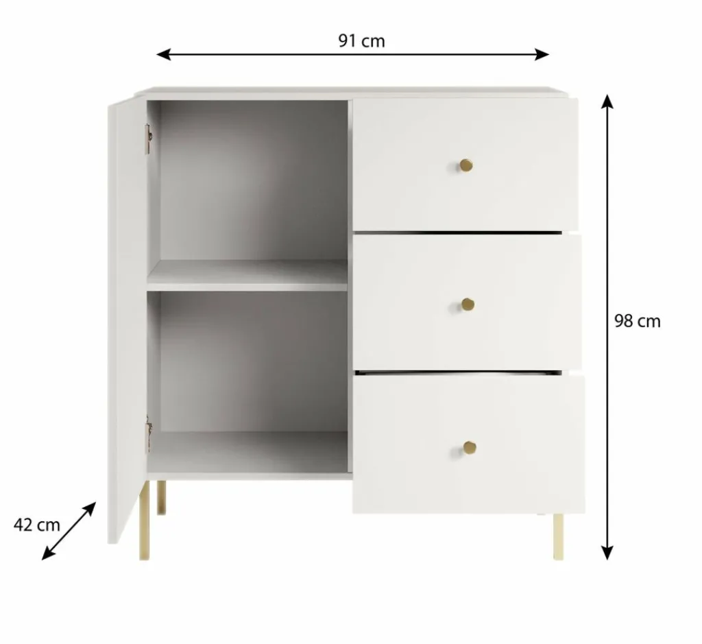 De kast heeft 1 deur en 3 lades. Deze openen via goudkleurige knoppen. Achter de deur zitten 2 opbergvakken. Op de voorkant van de deuren zitten latten.