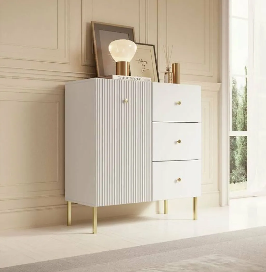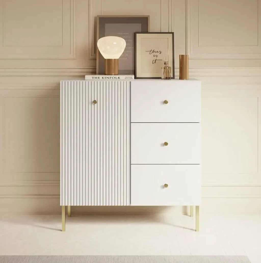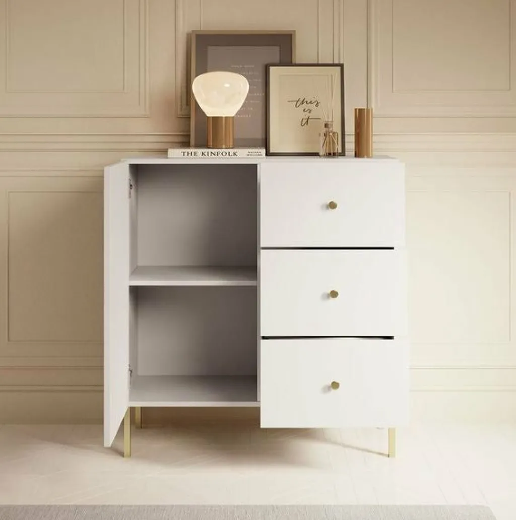 De kast heeft 1 deur en 3 lades. Deze openen via goudkleurige knoppen. Achter de deur zitten 2 opbergvakken. Op de voorkant van de deuren zitten latten.