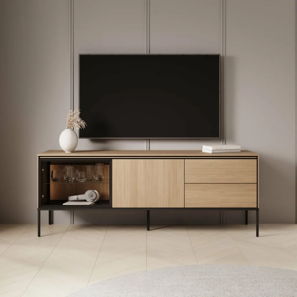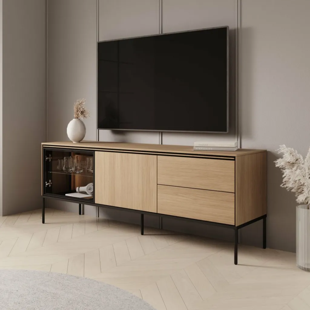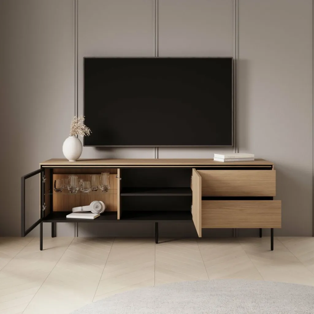 Het tv-meubel Vicious combineert een warme eikenhoutlook met moderne zwarte accenten en subtiele LED-verlichting. Deze stijlvolle mix zorgt voor een eigentijdse uitstraling die perfect past in een strak of Scandinavisch interieur.
