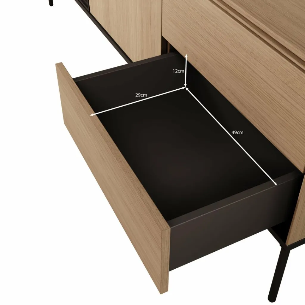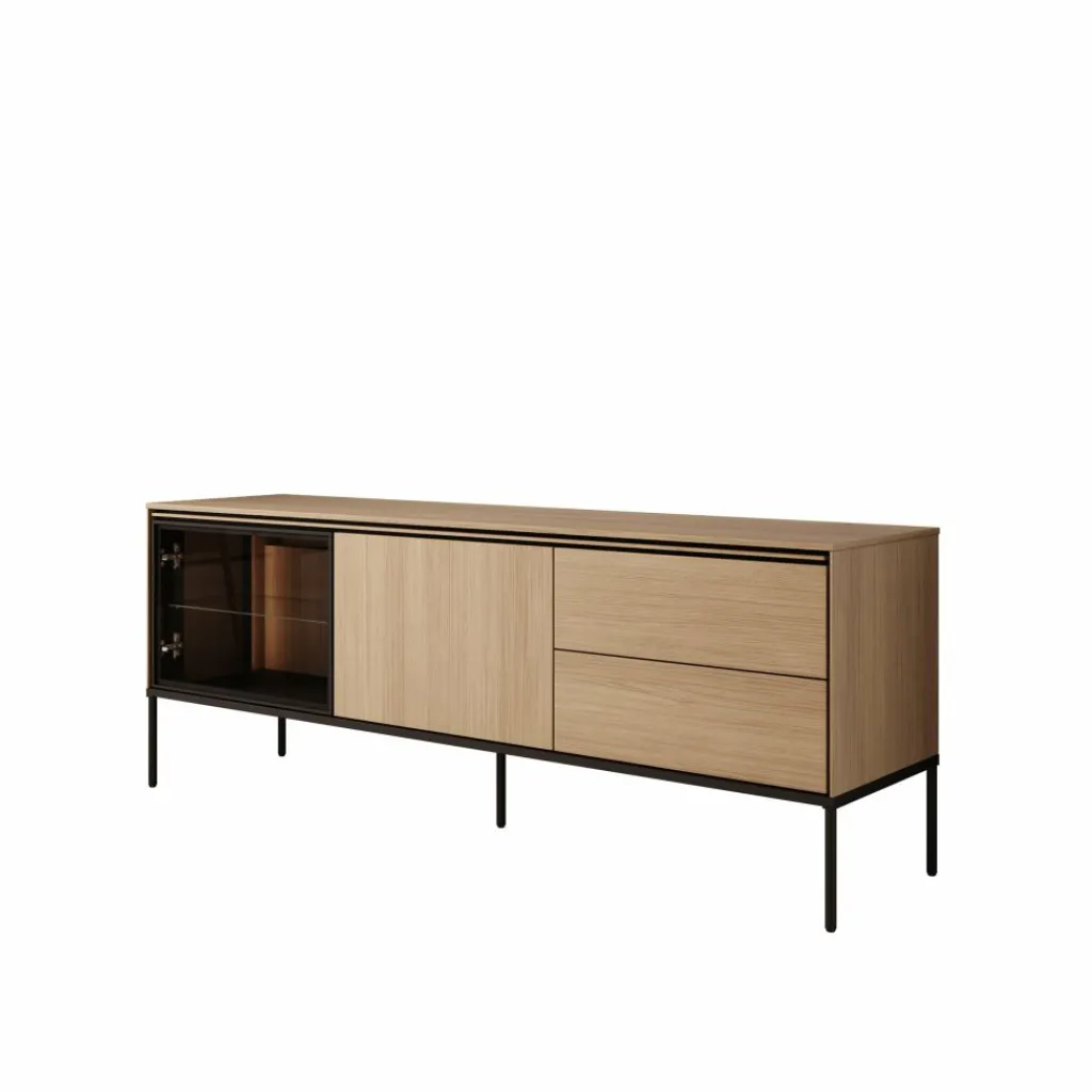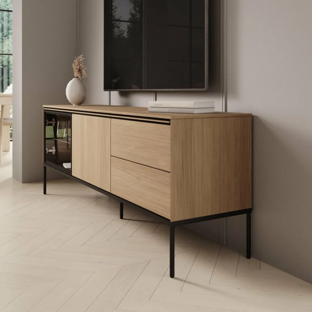 Het tv-meubel Vicious combineert een warme eikenhoutlook met moderne zwarte accenten en subtiele LED-verlichting. Deze stijlvolle mix zorgt voor een eigentijdse uitstraling die perfect past in een strak of Scandinavisch interieur.