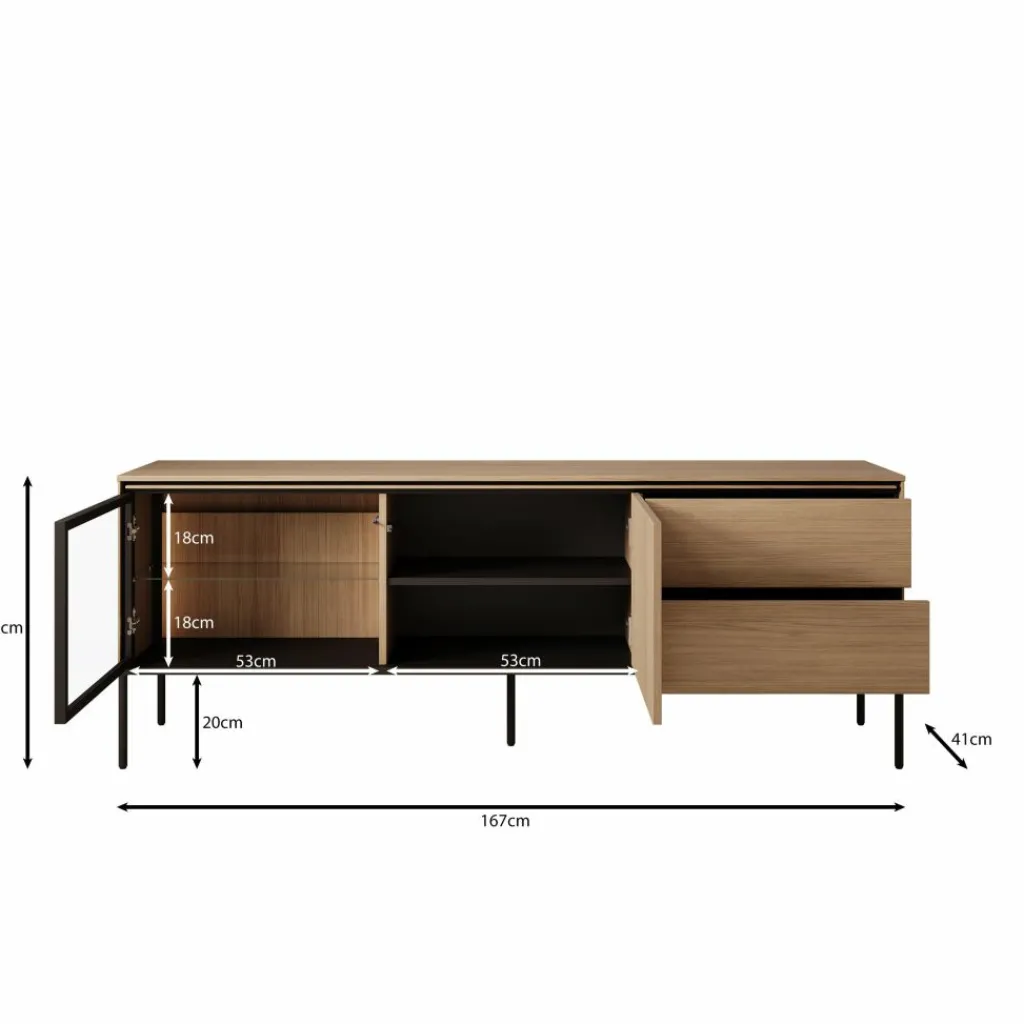 Het meubel is voorzien van twee ruime lades, een kast met deur en een open vitrinegedeelte met glazen legplank en LED-verlichting. Ideaal om apparatuur, accessoires of decoratieve items overzichtelijk op te bergen en tegelijkertijd mooi te presenteren.