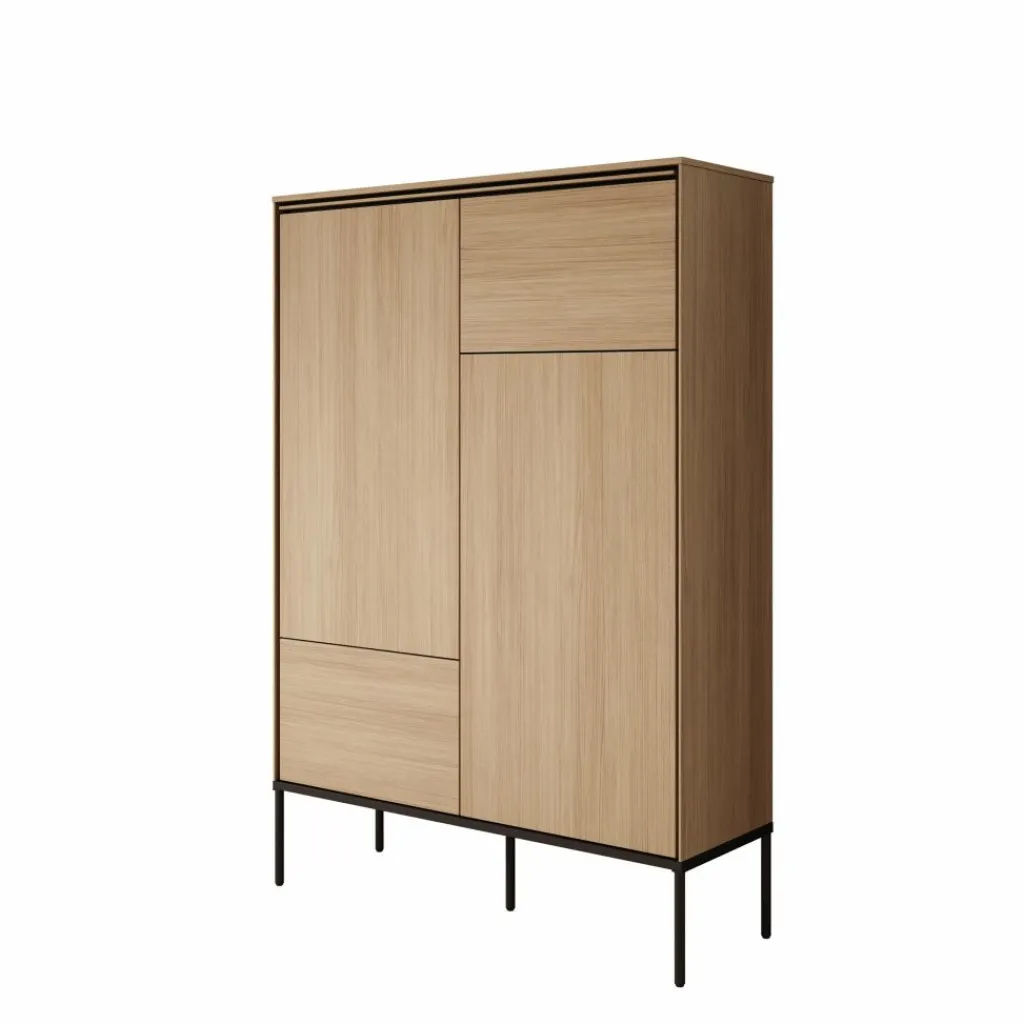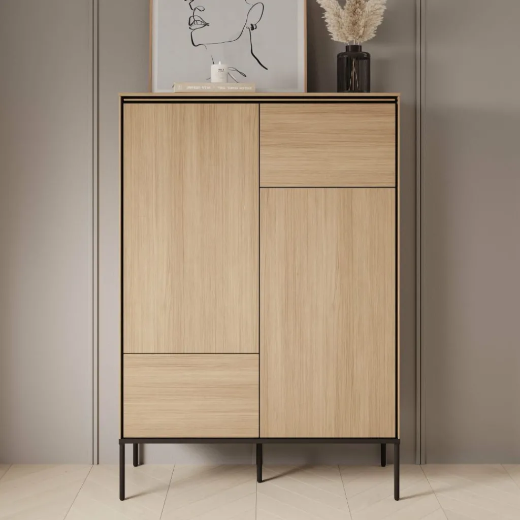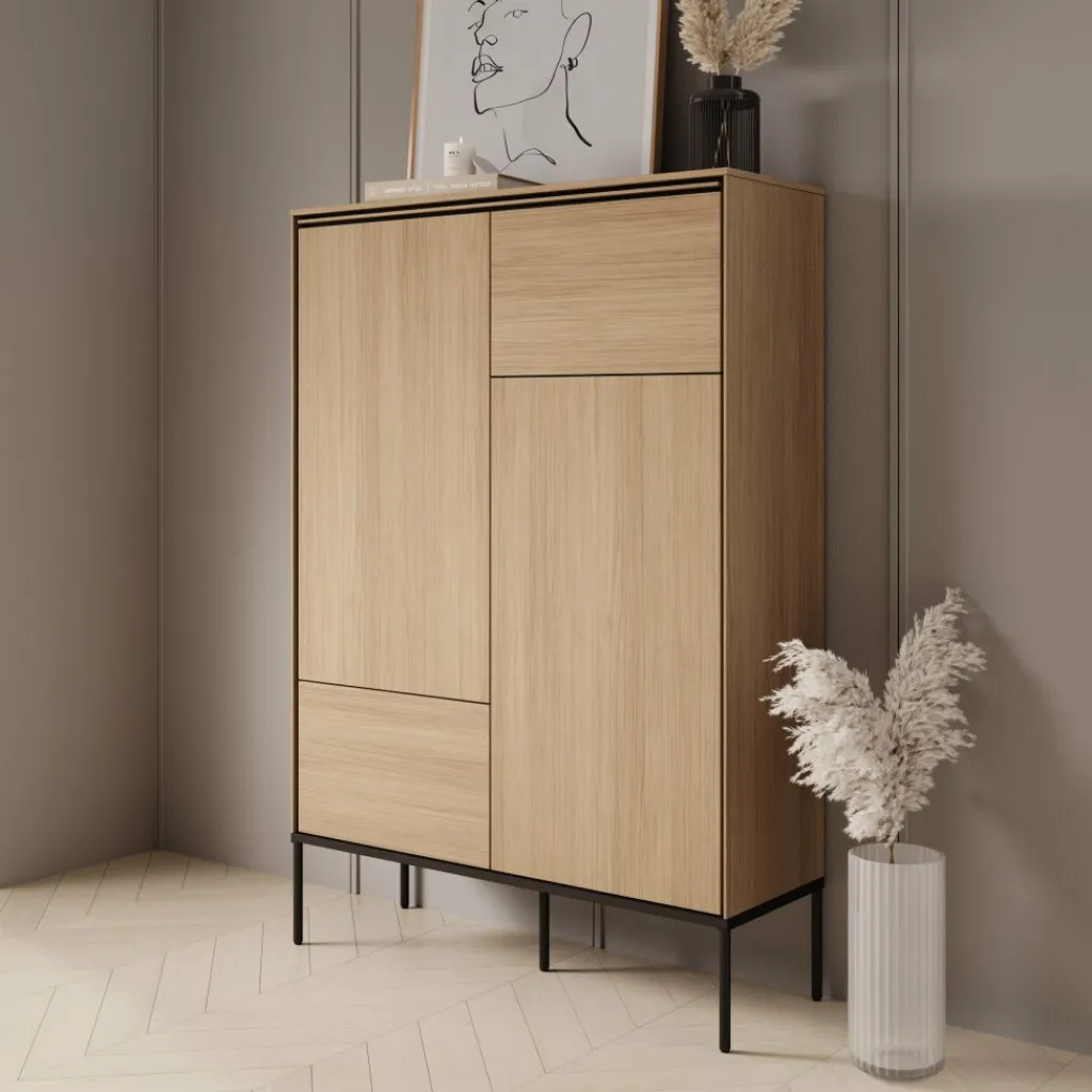 De Vicious kast in eikenhoutlook combineert een warme, natuurlijke uitstraling met een moderne en minimalistische vormgeving. De hoge, slanke proporties zorgen voor een elegante aanblik, terwijl de zwarte metalen poten en details een eigentijdse touch toevoegen.