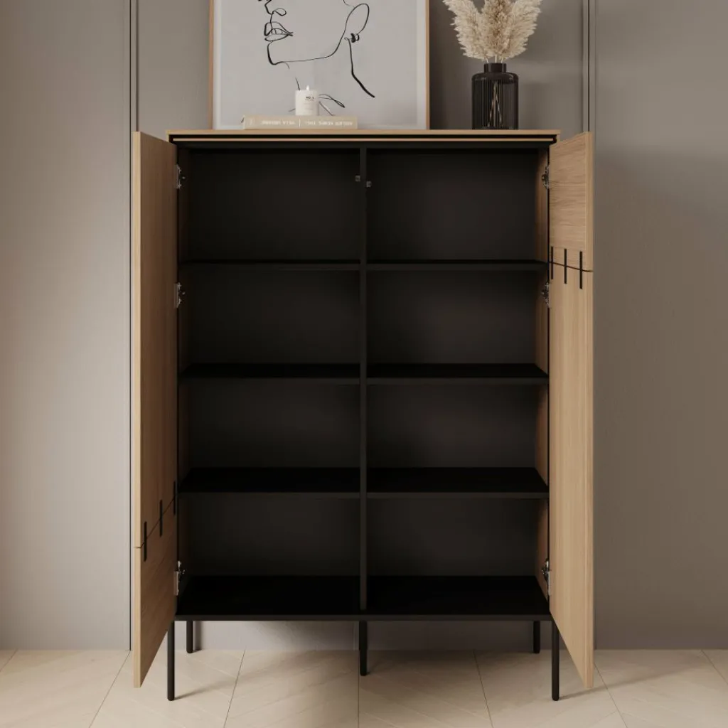 Achter de vier deuren bevindt zich een royale opbergruimte met meerdere legplanken, ideaal voor het netjes opbergen van servies, boeken of andere accessoires. Dankzij het strakke ontwerp en de hoogwaardige afwerking past deze kast moeiteloos in diverse interieurs, van modern tot Scandinavisch.