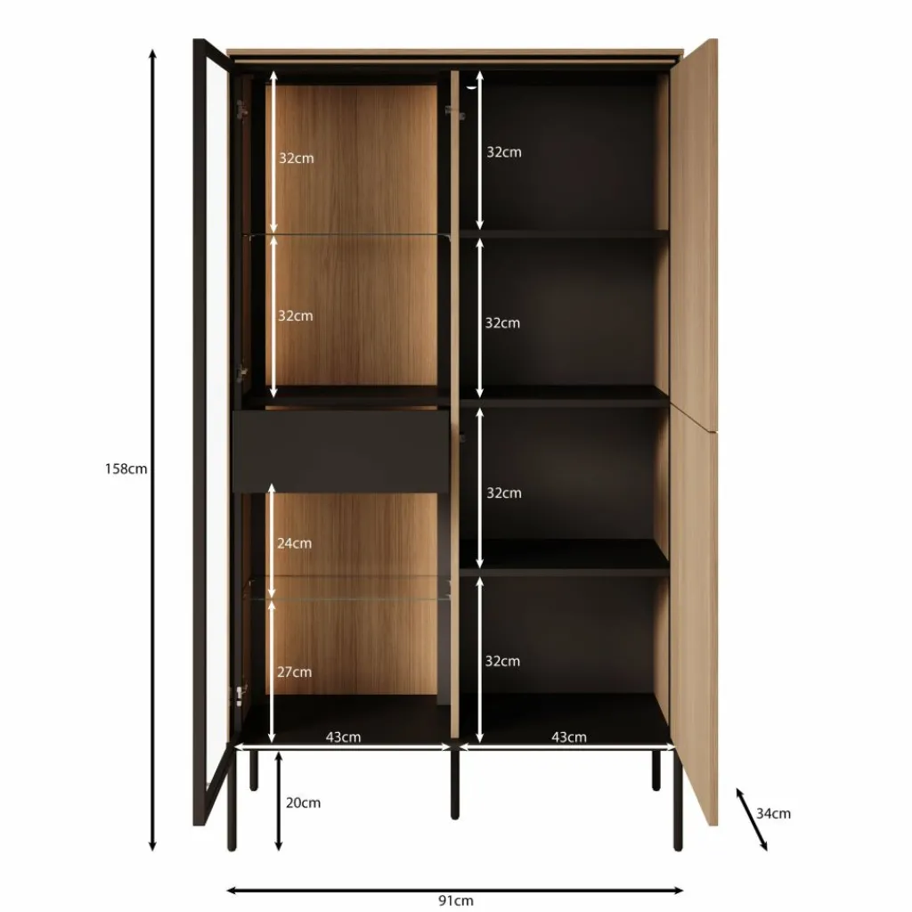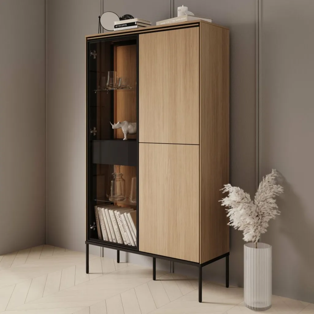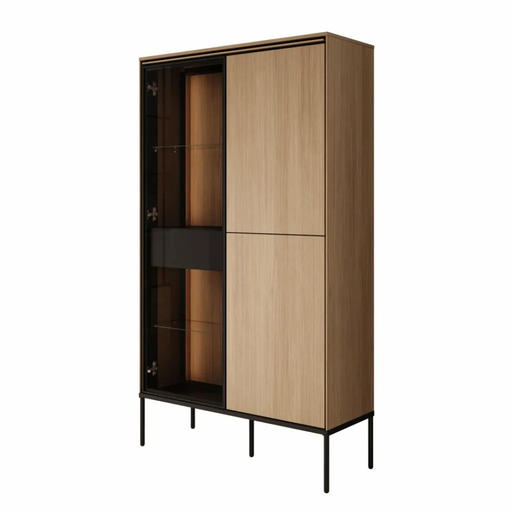 De Vicious vitrinekast in eikenlook combineert stijl en functionaliteit in een eigentijds ontwerp. De kast heeft een warme houtkleur met zwarte accenten en rust op slanke metalen poten voor een luchtige uitstraling. Dankzij de glazen deur met LED-verlichting kun je decoratieve items of servies elegant presenteren, terwijl de gesloten opbergvakken ruimte bieden voor spullen die je liever uit het zicht houdt. De combinatie van glas, hout en metaal zorgt voor een moderne, maar tijdloze uitstraling die perfect past in een Scandinavisch of industrieel interieur.