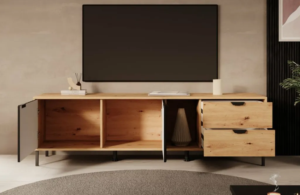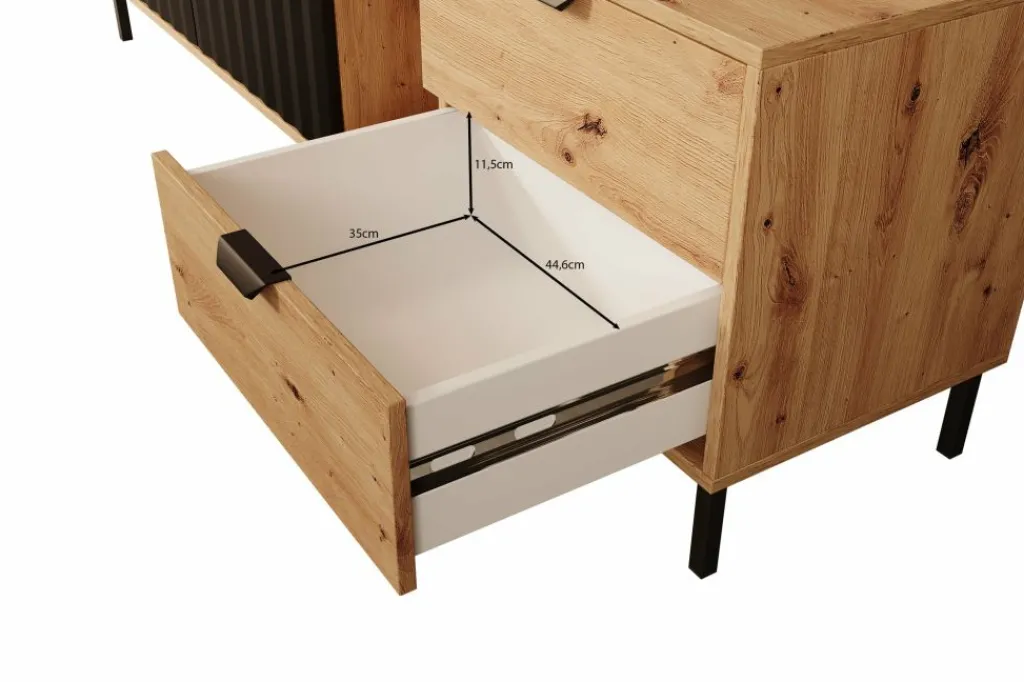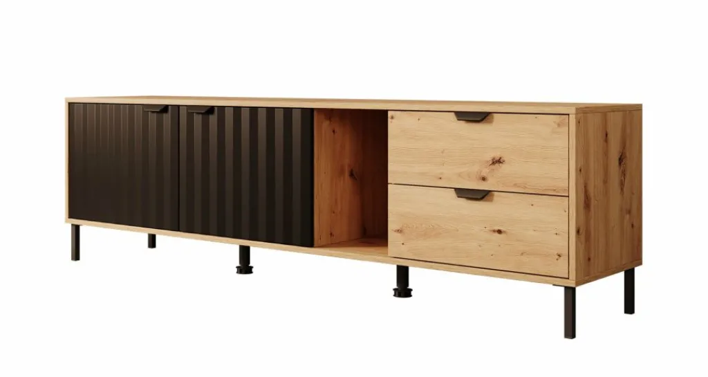 TV-Meubel Vic is een opbergkast voor onder de tv in een moderne stijl. De TV kast beschikt over 1 open vak, 2 deuren en 2 lades die openen met zwart metalen handgrepen. Het meubel is uitgevoerd in een zwart met eiken kleur. Het meubel staat op metalen poten en er zit geen uitsparing in de achterwand.