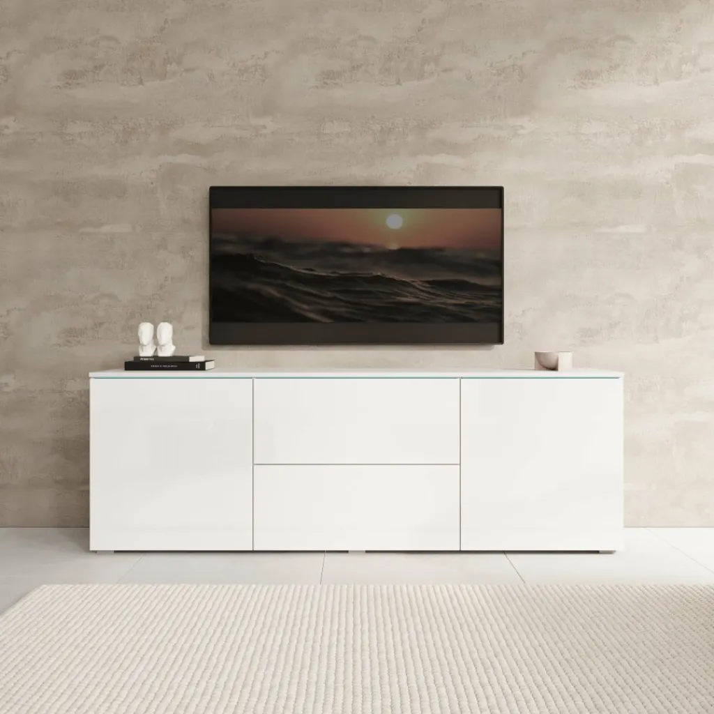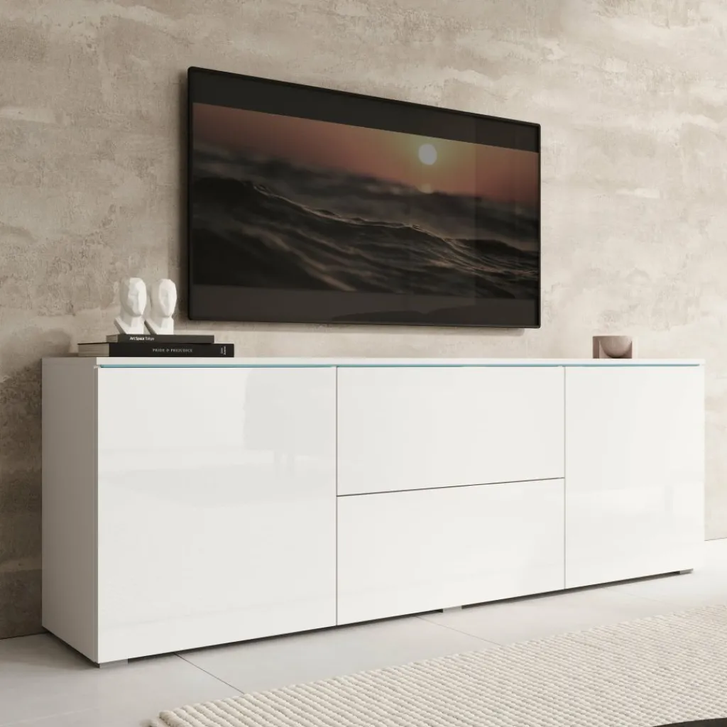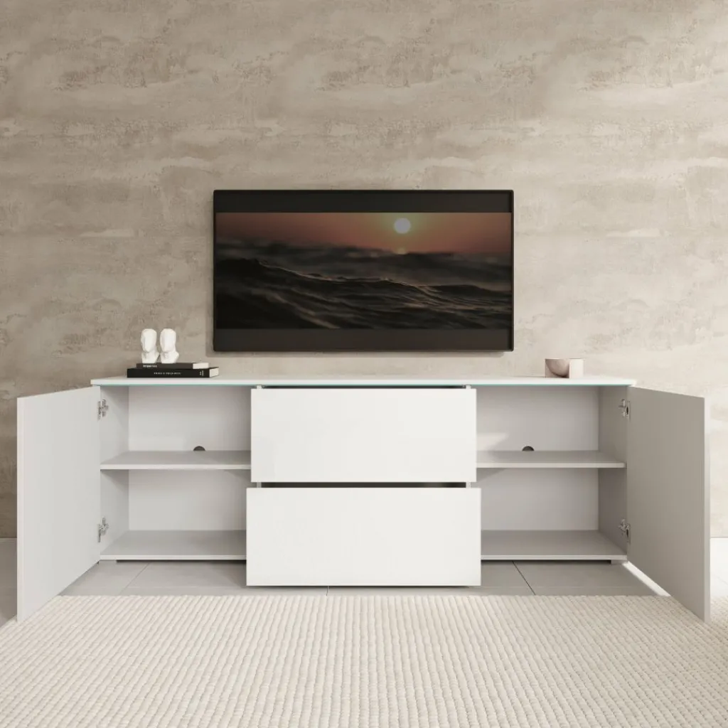 TV-Meubel Vico is een opbergkast voor onder de tv in een moderne stijl. De TV-kast is gemaakt in een wit met hoogglans witte voorkant. TV-Meubel Vico beschikt over 2 deuren en 2 lades die openen met het push to open systeem. Achter de deuren zitten nog in totaal 4 opbergvakken. Het lichtblauwe wat je aan de bovenkant ziet, zijn glasplaatjes wat zorgt voor een mooie uitstraling. In de achterwand zitten 2 uitsparingen om bedrading te kunnen wegwerken.