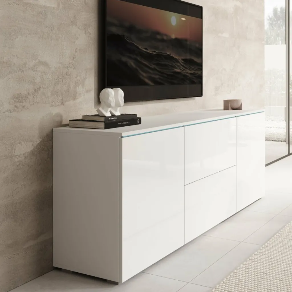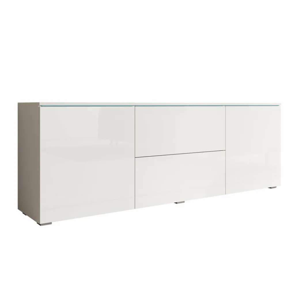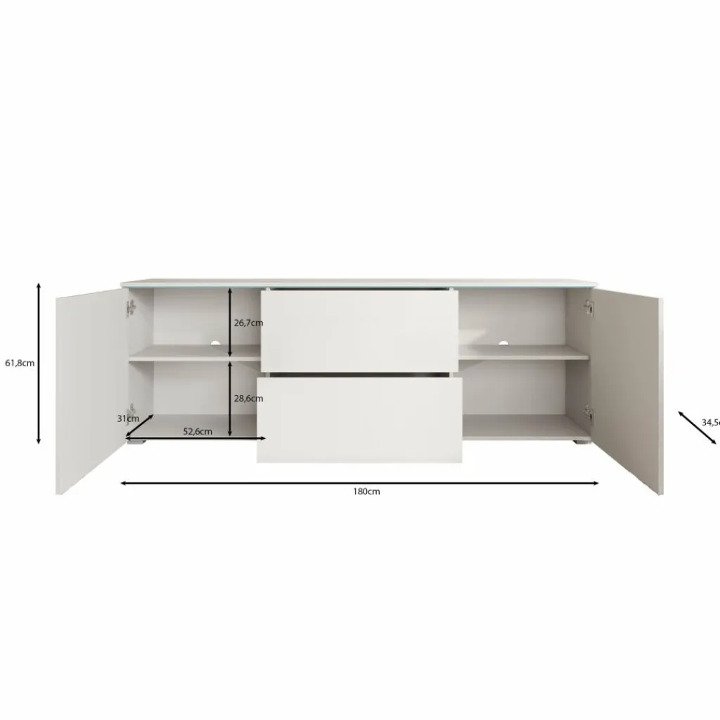 TV-Meubel Vico is een opbergkast voor onder de tv in een moderne stijl. De TV-kast is gemaakt in een wit met hoogglans witte voorkant. TV-Meubel Vico beschikt over 2 deuren en 2 lades die openen met het push to open systeem. Achter de deuren zitten nog in totaal 4 opbergvakken. Het lichtblauwe wat je aan de bovenkant ziet, zijn glasplaatjes wat zorgt voor een mooie uitstraling. In de achterwand zitten 2 uitsparingen om bedrading te kunnen wegwerken.
